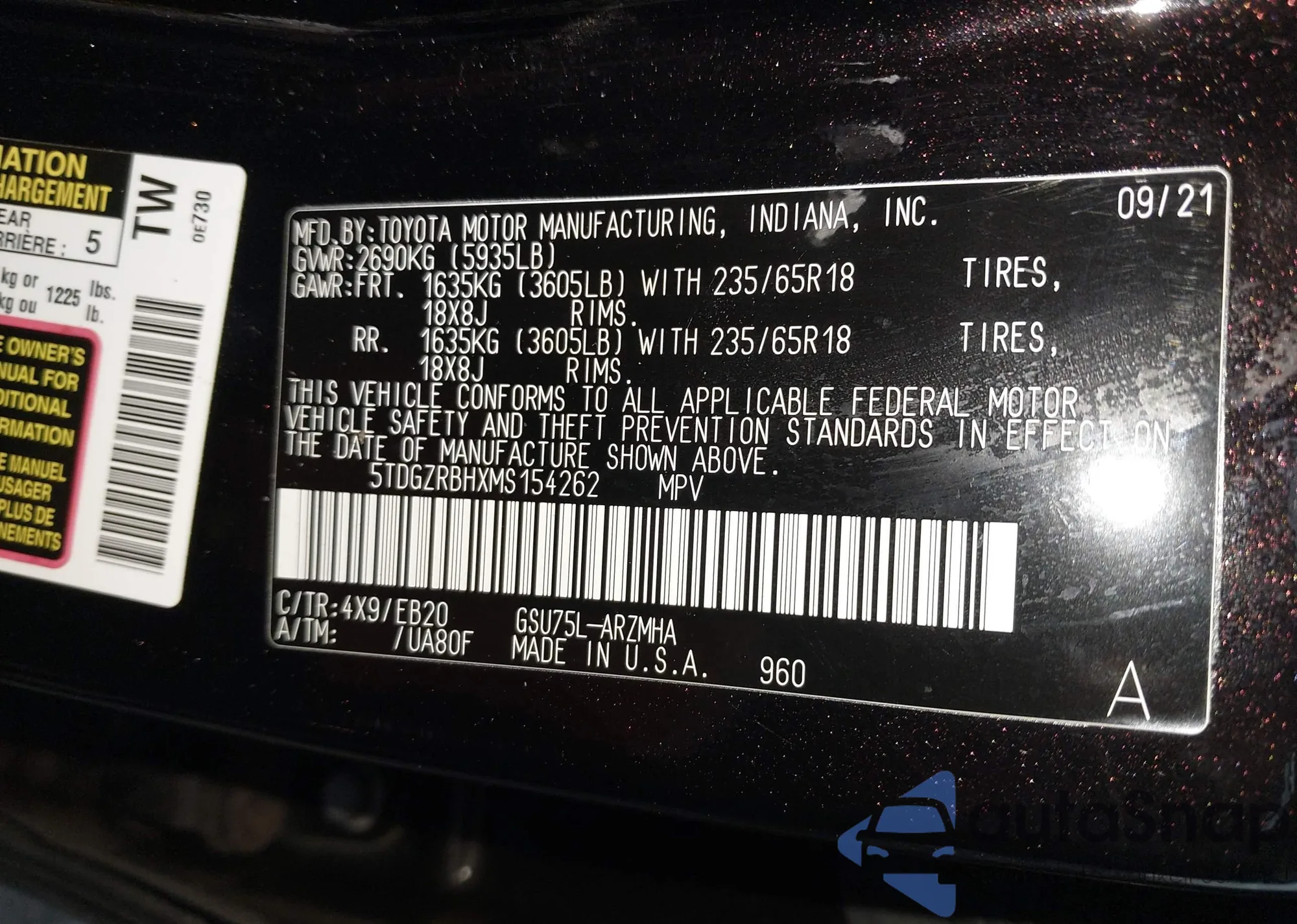 LOT: 44292460 VIN: 5TDCZRAH9MS521880