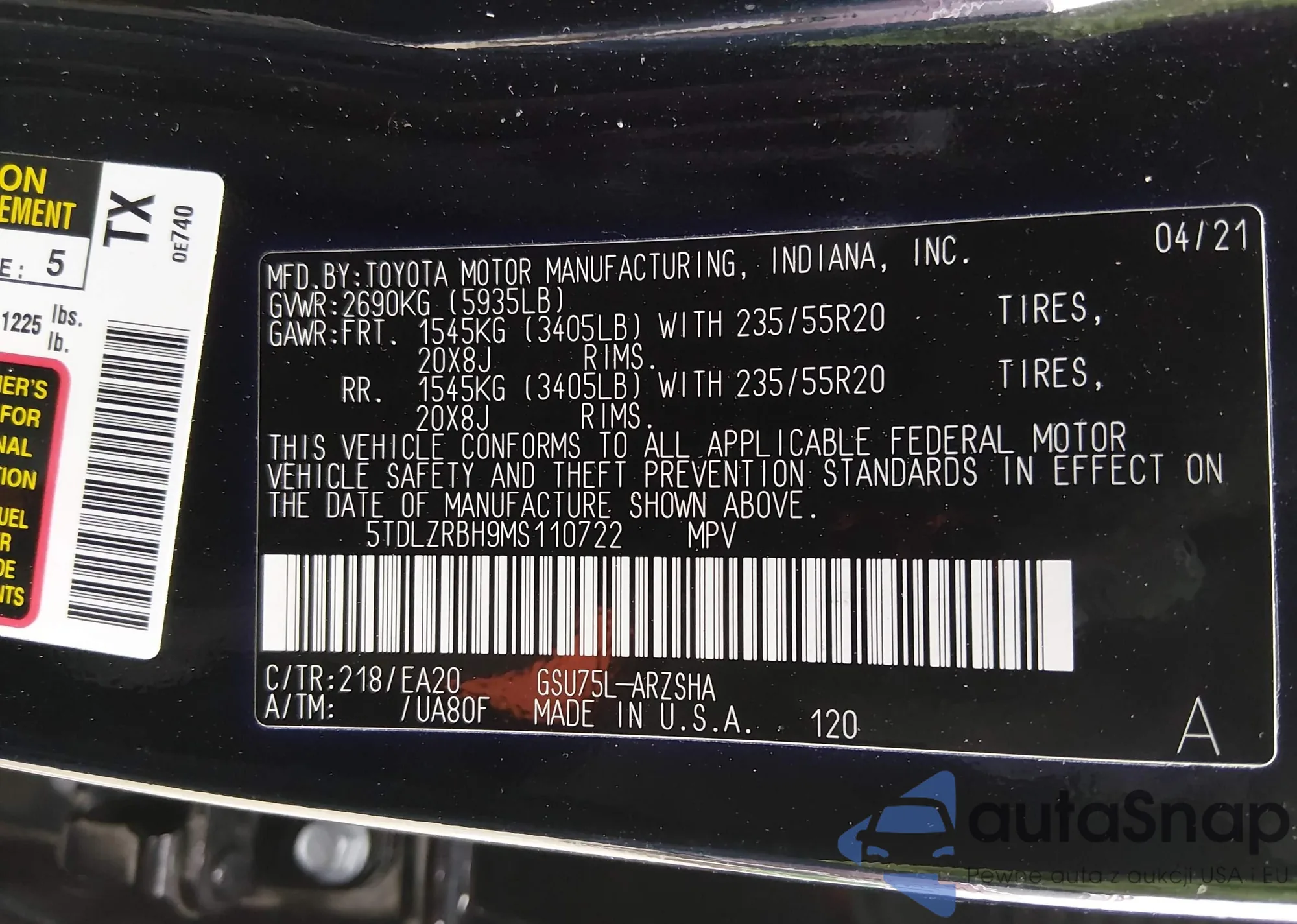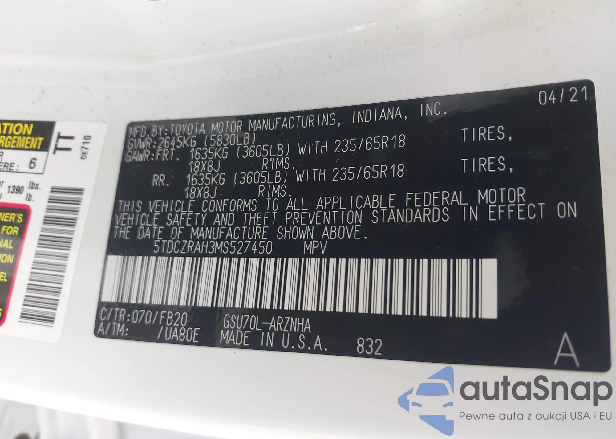 LOT: 44287874 VIN: 5TDCZRAH3MS527450