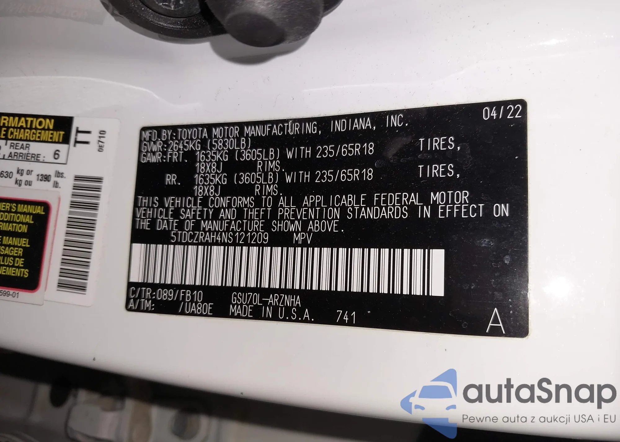 LOT: 44290648 VIN: 5TDCZRAH4NS121209