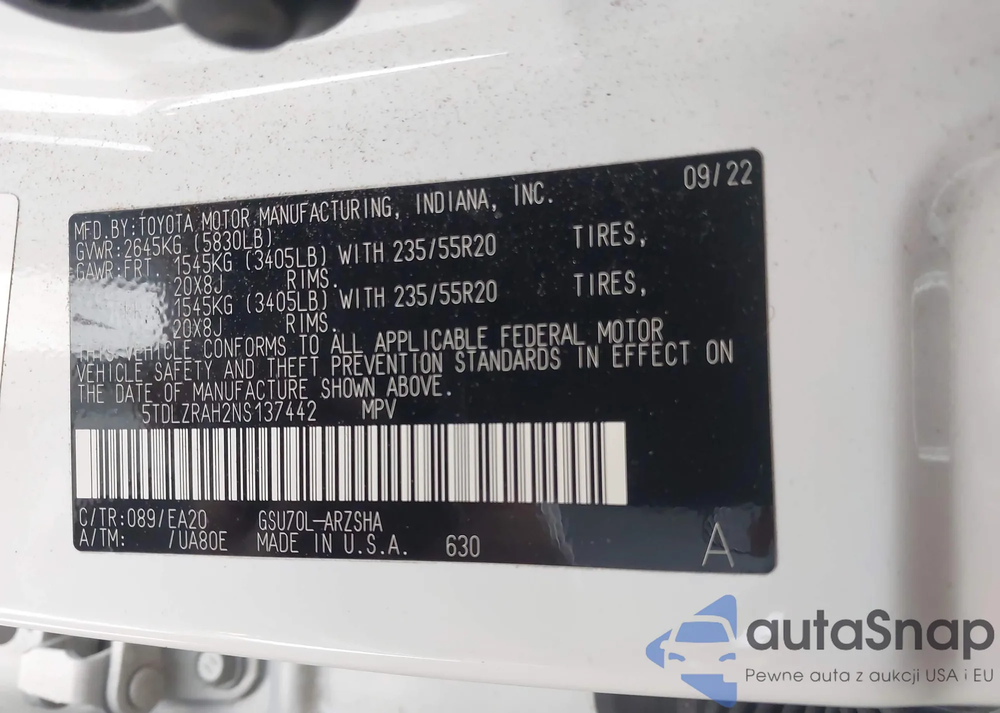 LOT: 44293807 VIN: 5TDLZRAH2NS137442