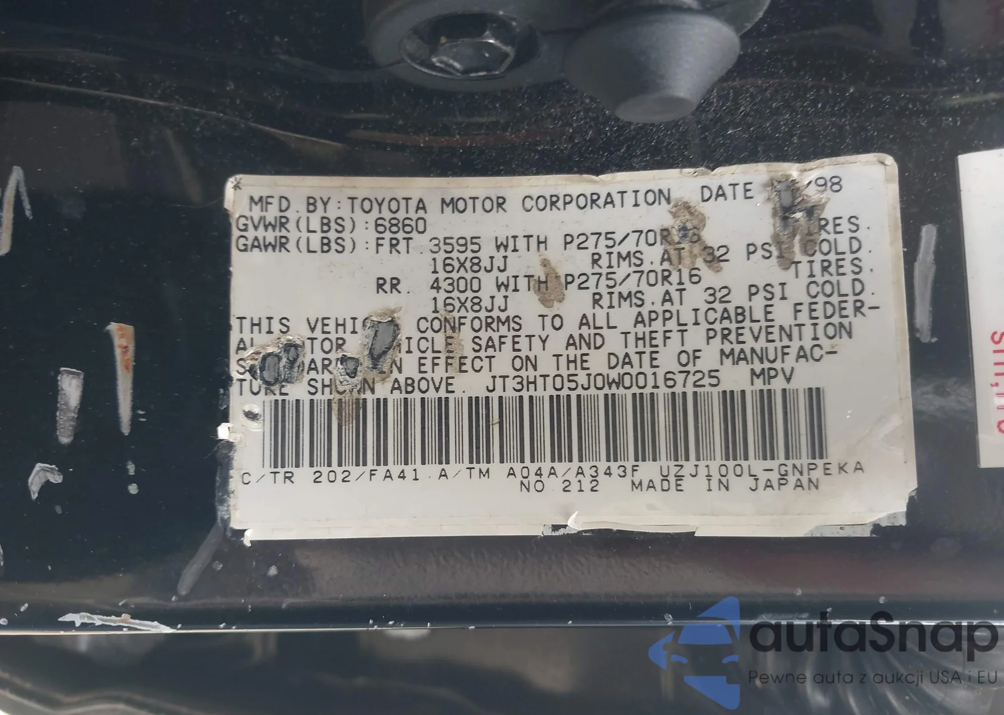 1998 Toyota Land Cruiser from USA, damaged, VIN JT3HT05J0W0016725