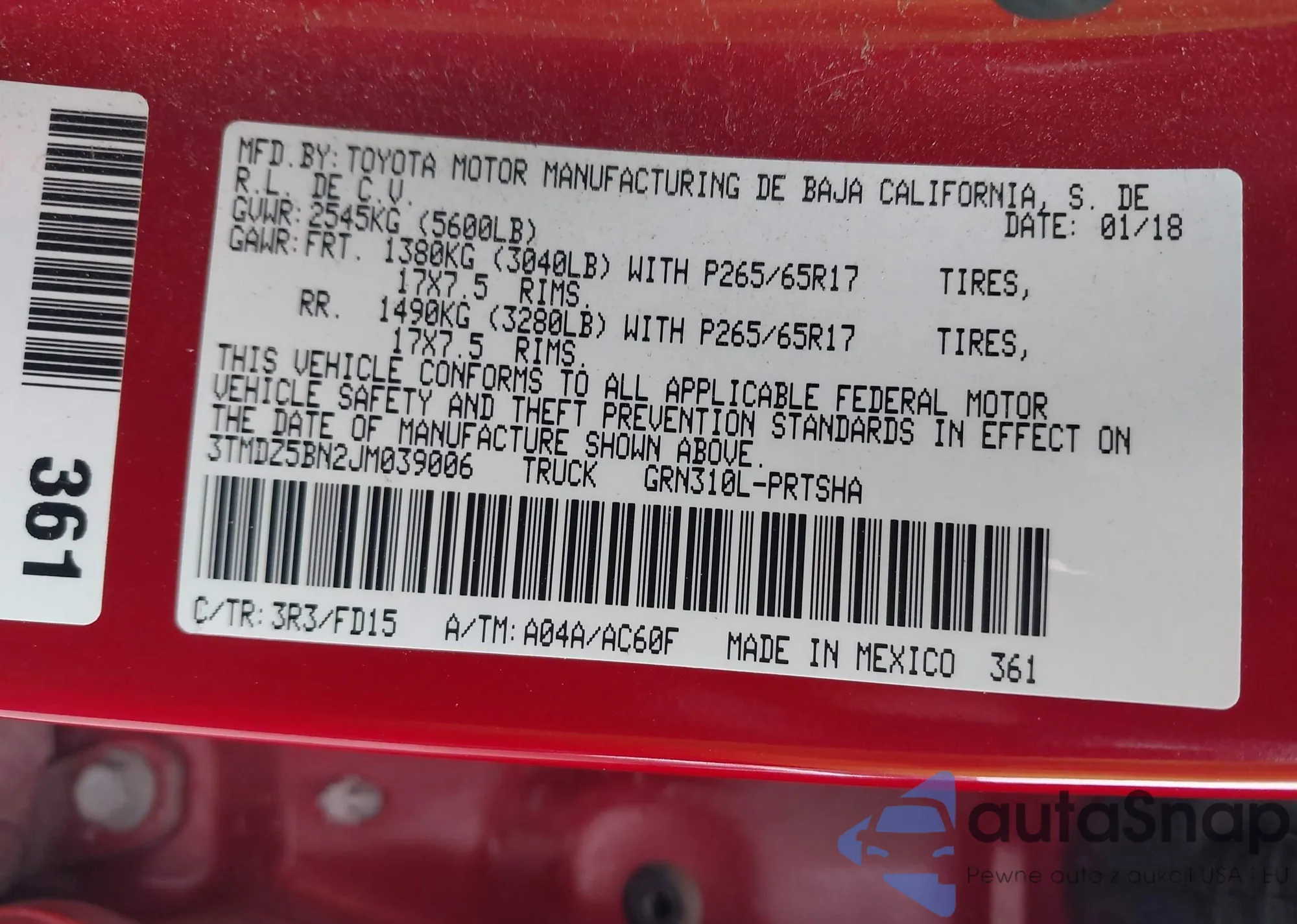LOT: 44042694 VIN: 3TMDZ5BN2JM039006