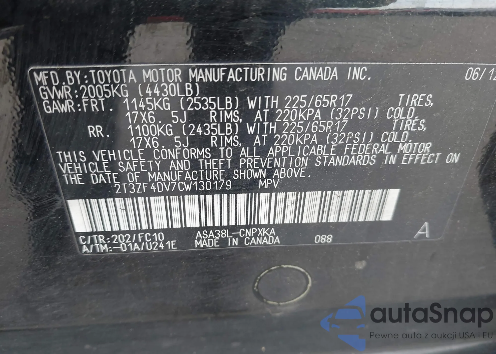 • VIN 2T3ZF4DV7CW130179