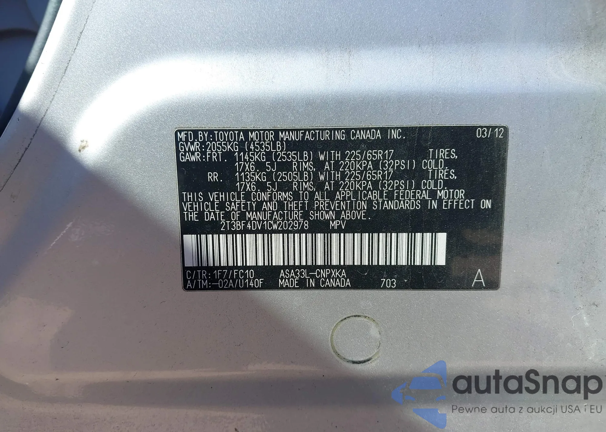 • VIN 2T3BF4DV1CW202978