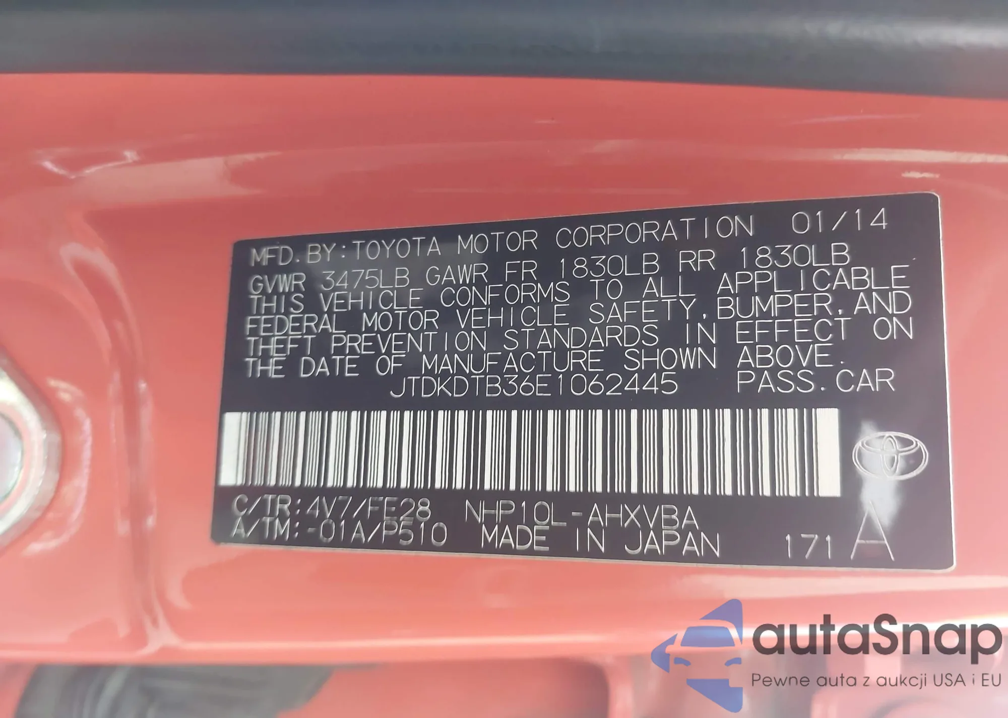 LOT: 44112593 VIN: JTDKDTB36E1062445