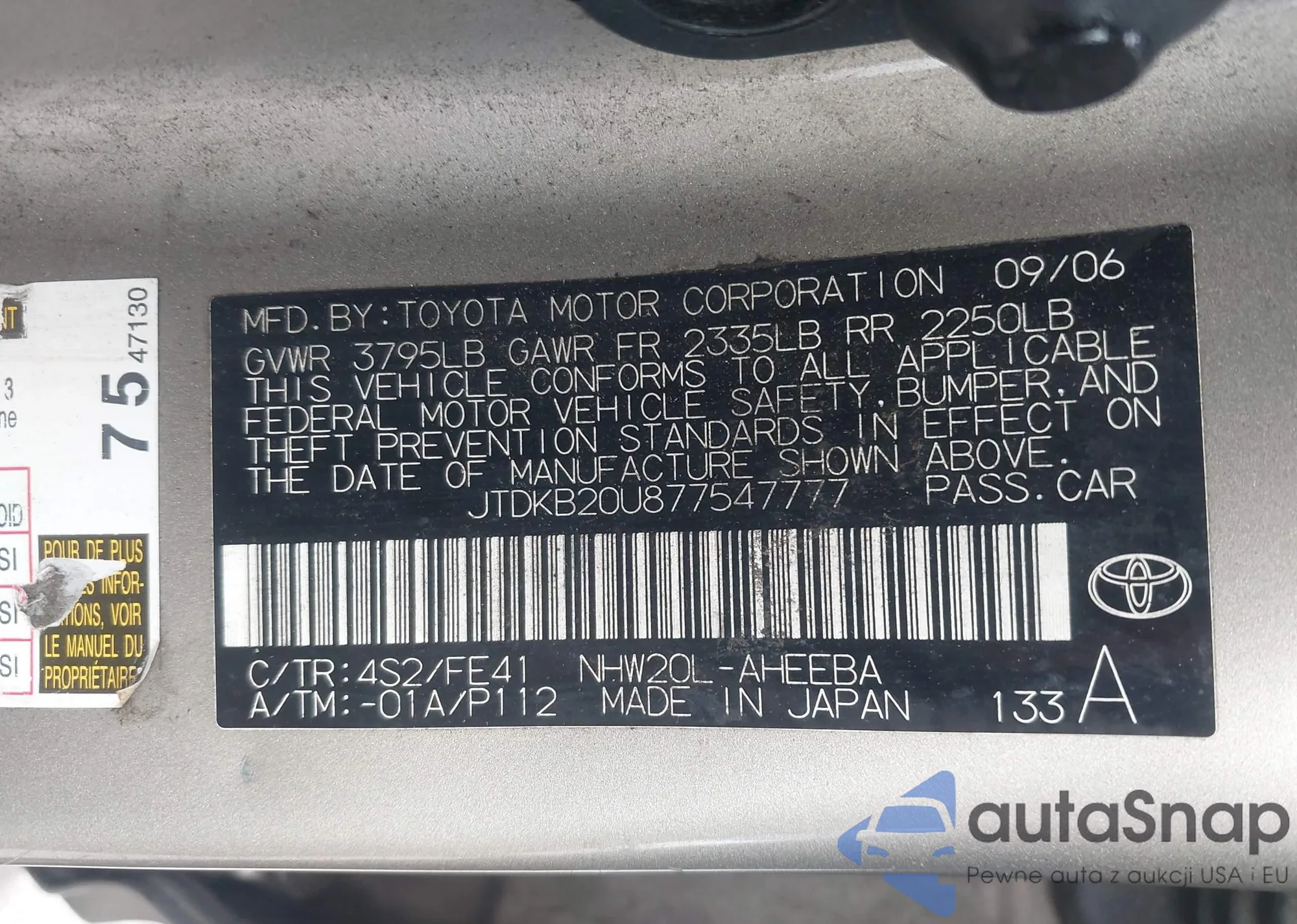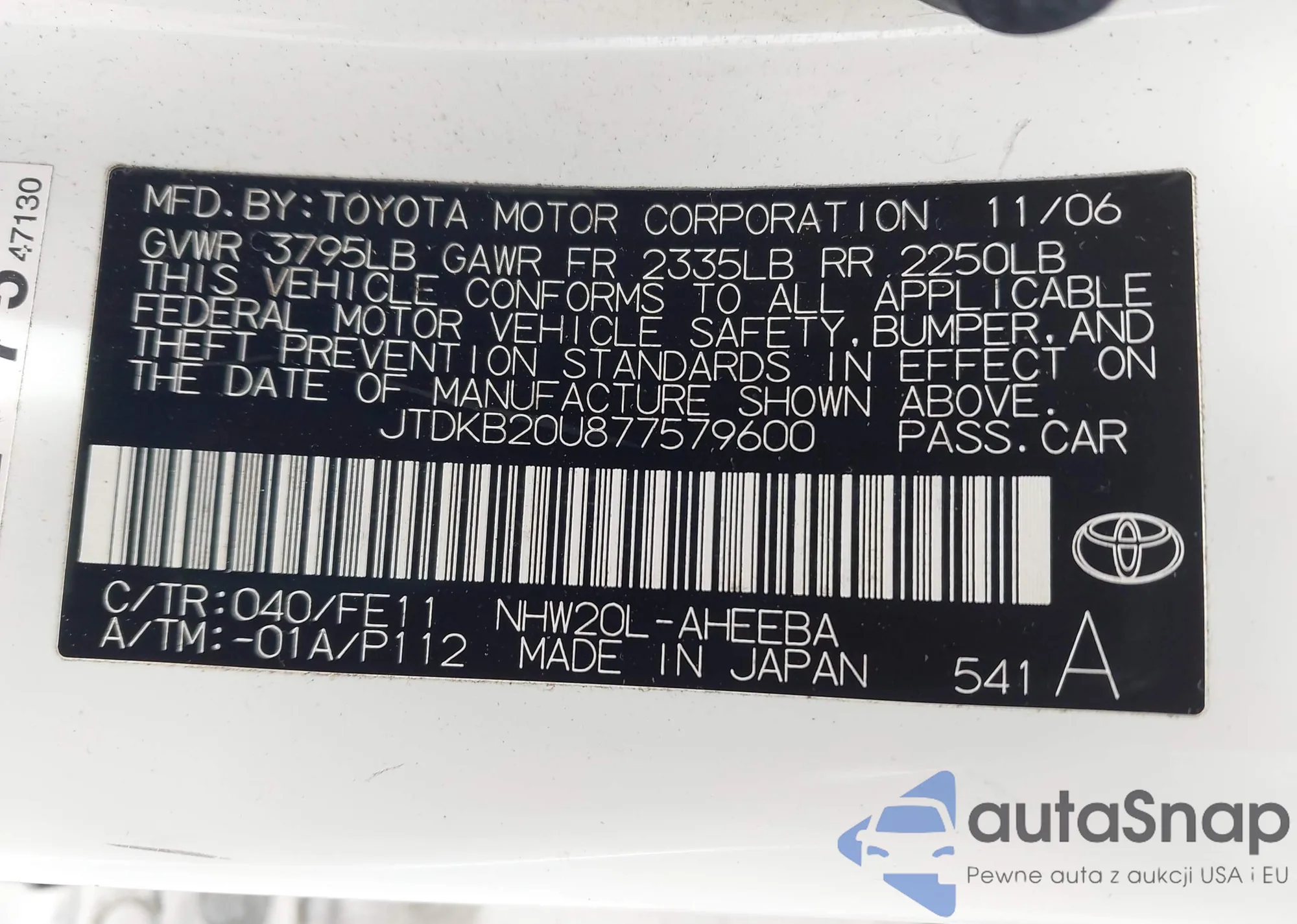 LOT: 44053229 VIN: JTDKB20U877579600