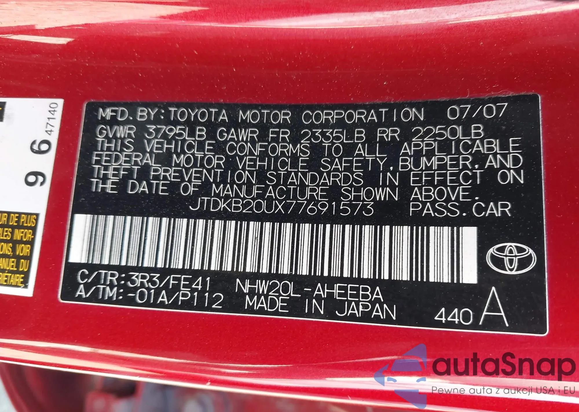 LOT: 44066446 VIN: JTDKB20UX77691573