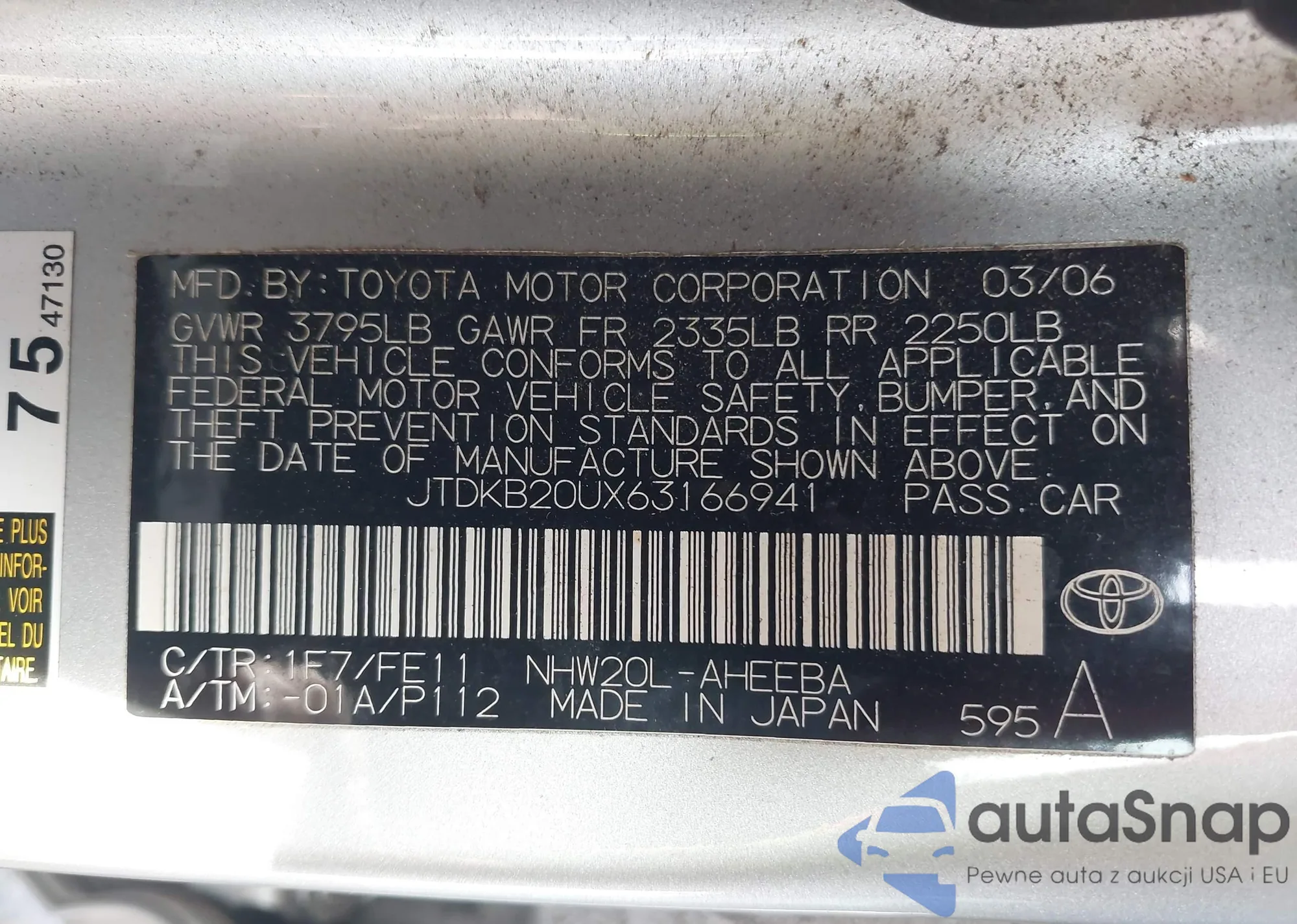 LOT: 44021247 VIN: JTDKB20UX63166941