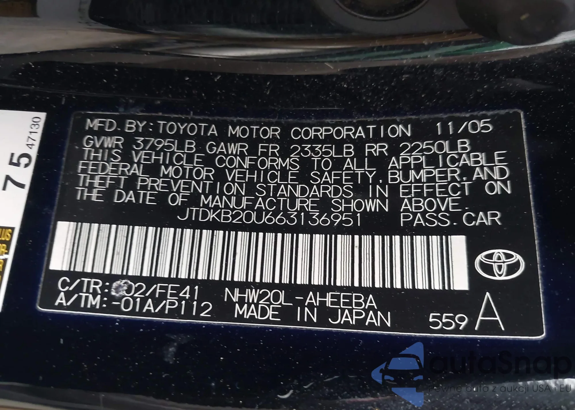LOT: 44055599 VIN: JTDKB20U663136951