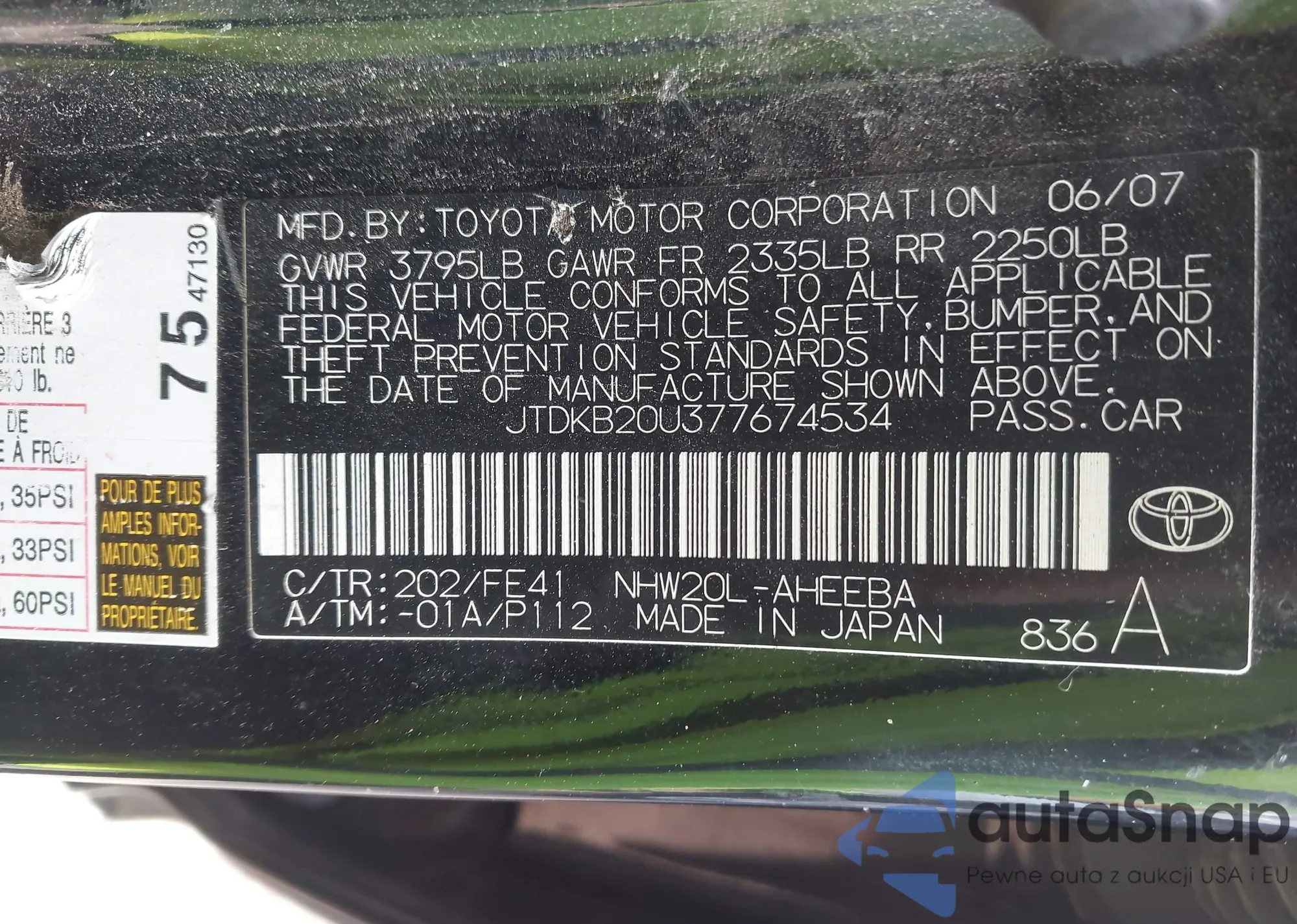 2007 Toyota Prius from USA, damaged, VIN JTDKB20U377674534