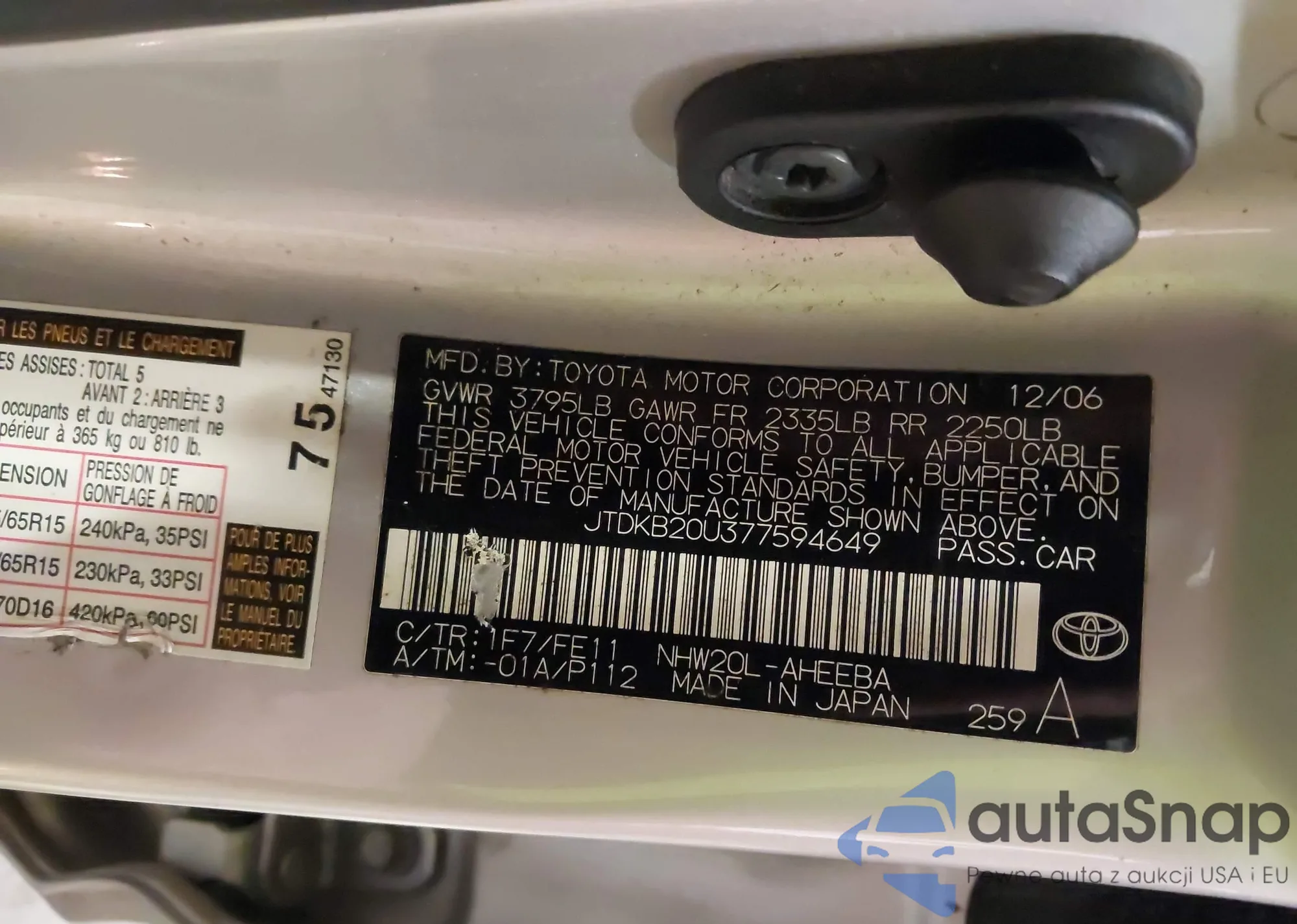 LOT: 44243470 VIN: JTDKB20U377594649