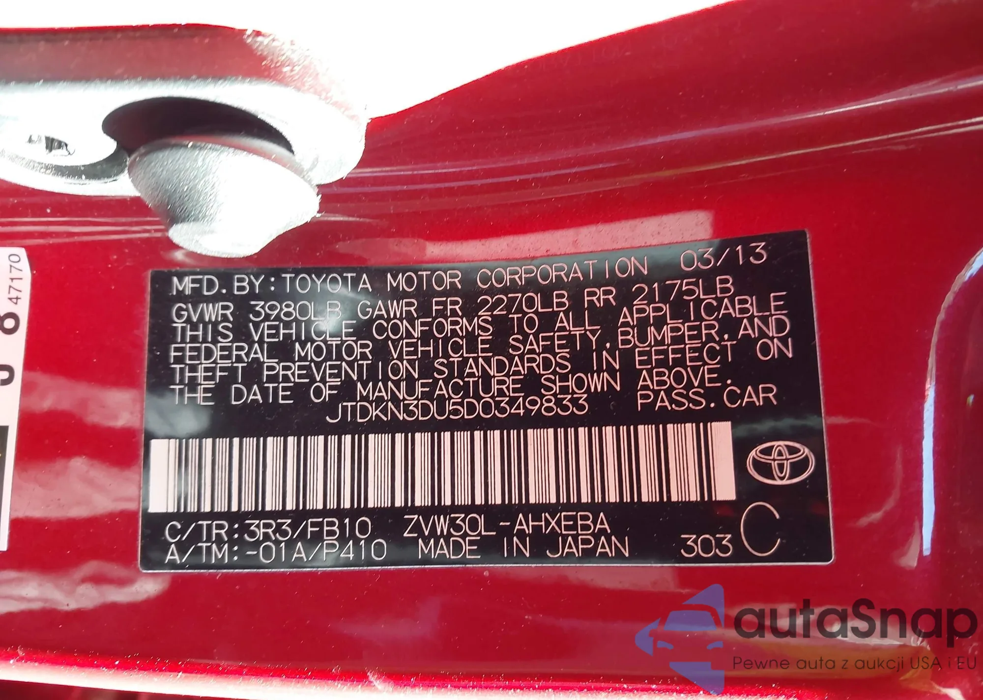LOT: 44283908 VIN: JTDKN3DU5D0349833