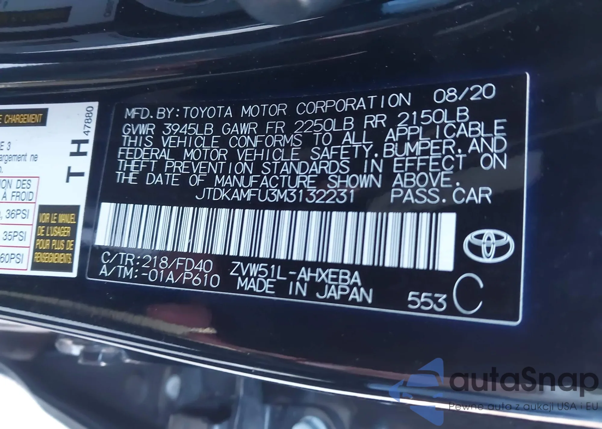 LOT: 44178518 VIN: JTDKAMFU8M3149963
