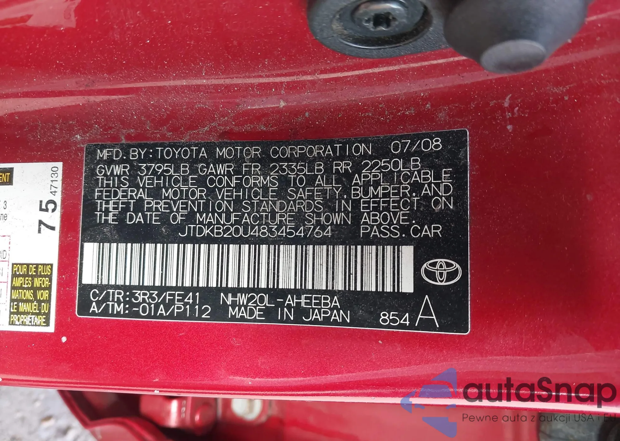 LOT: 44344830 VIN: JTDKB20U483454764