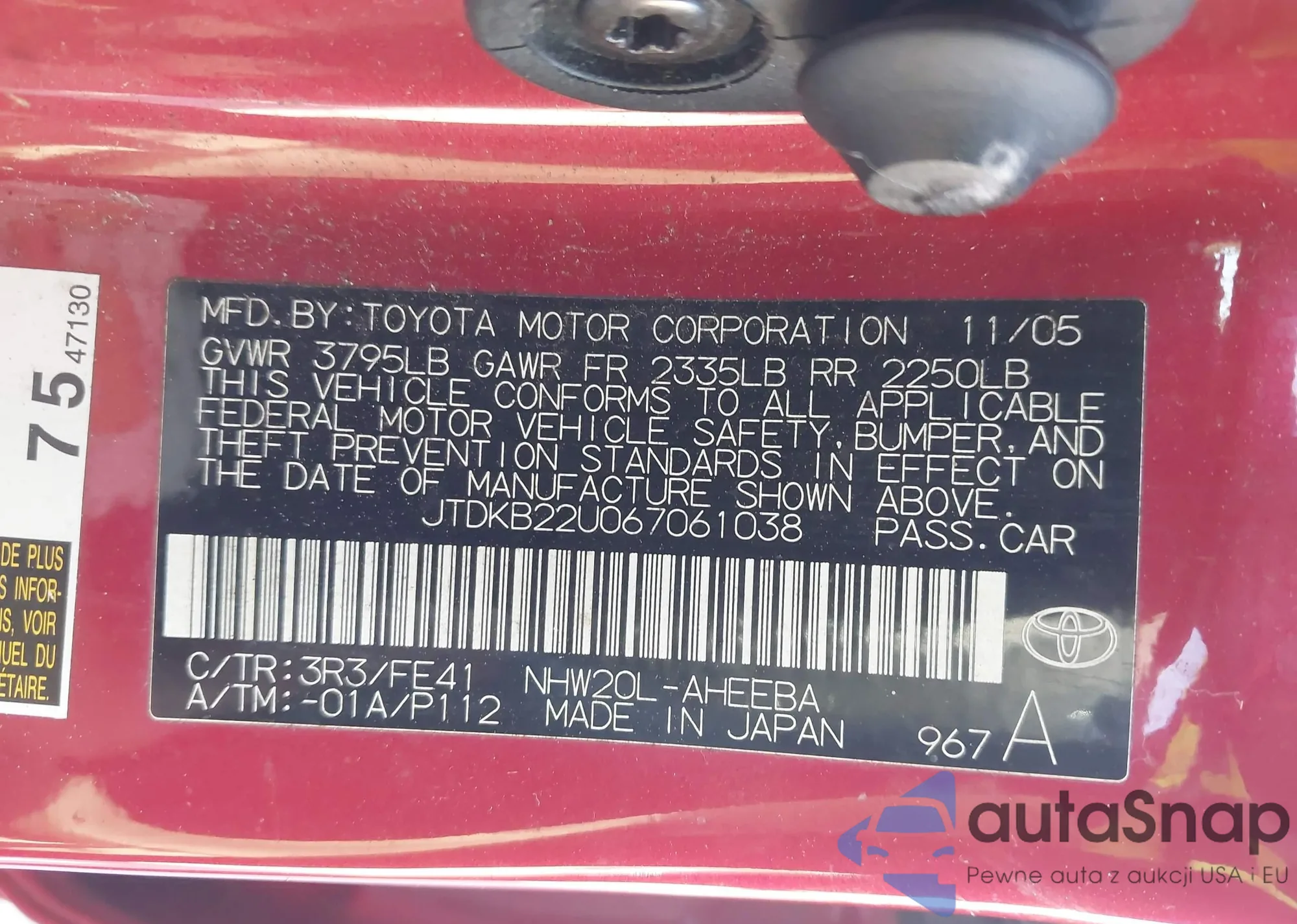 LOT: 44348029 VIN: JTDKB22U067061038