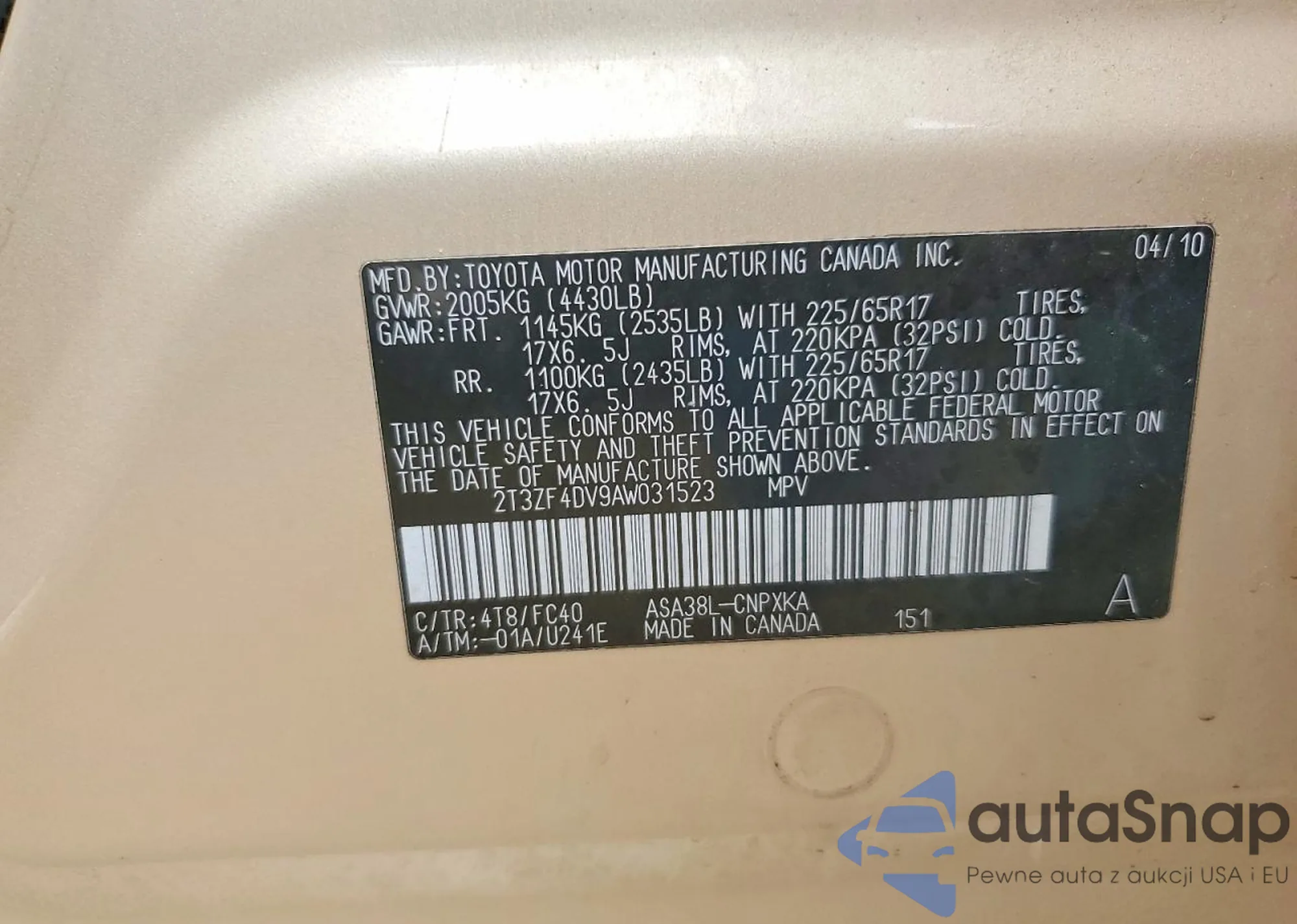 • VIN 2T3ZF4DV9AW031523