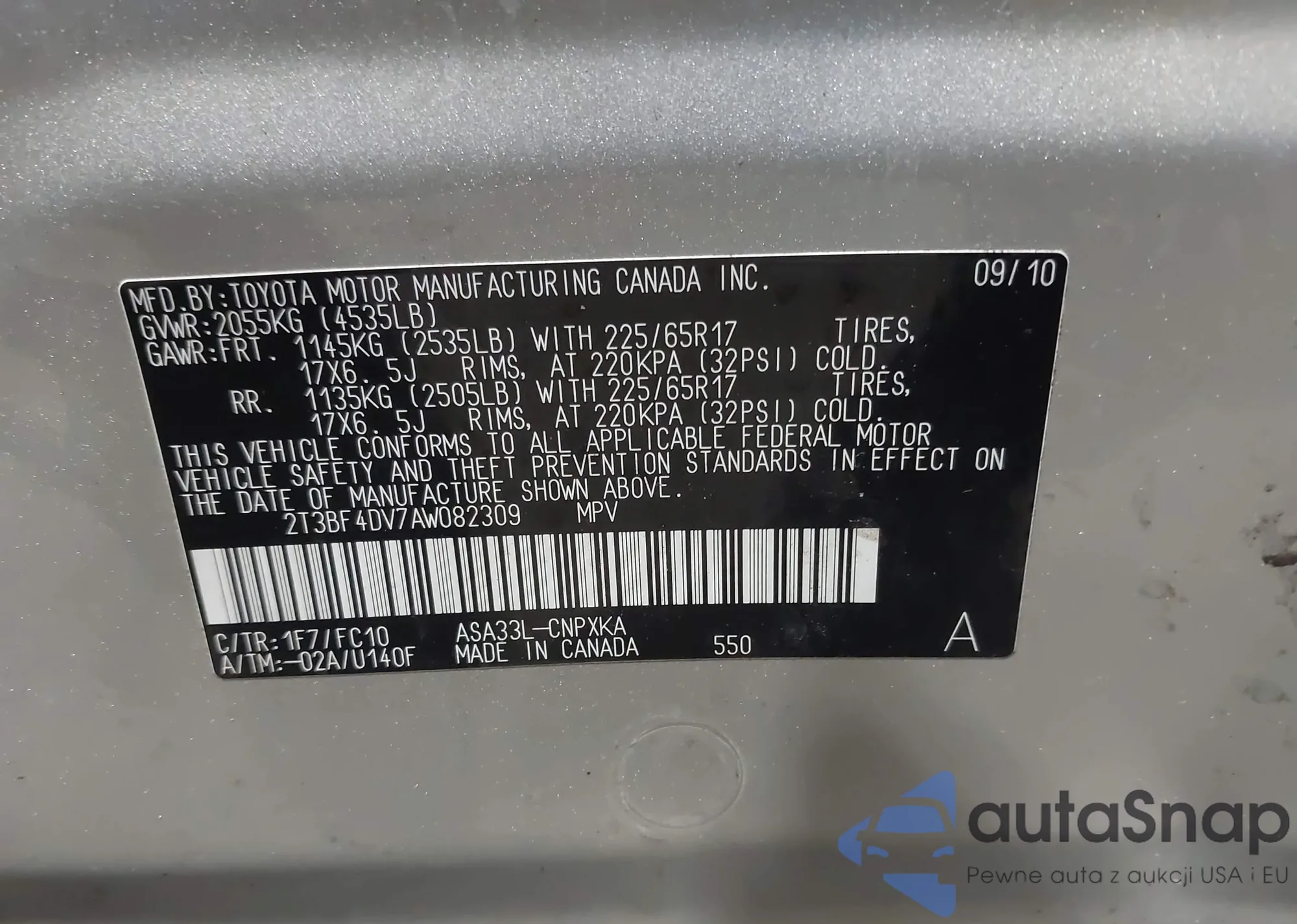 • VIN 2T3BF4DV7AW082309
