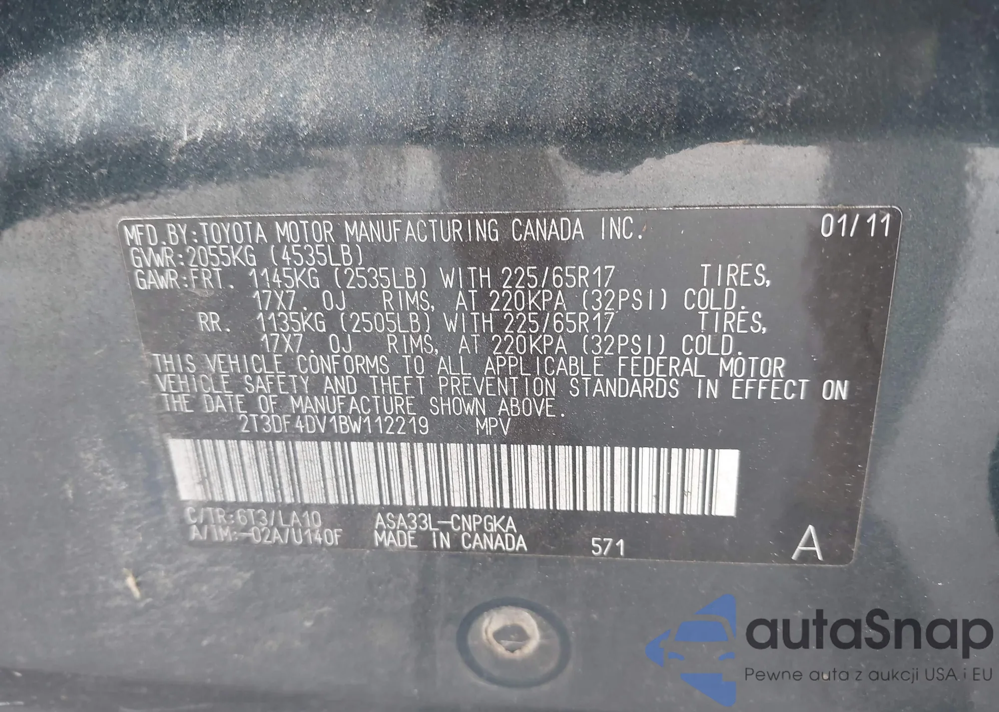LOT: 42144368 VIN: 2T3DF4DV1BW112219