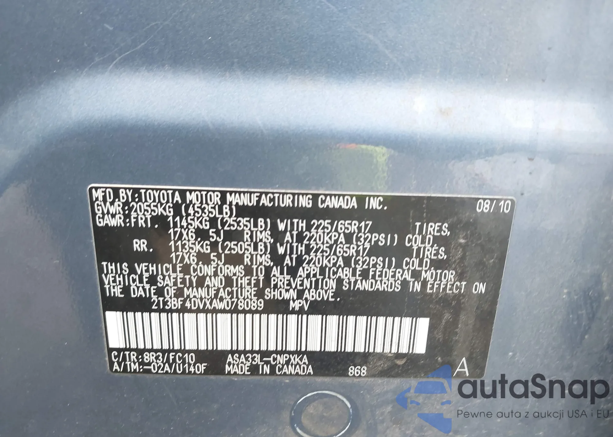 • VIN 2T3BF4DVXAW078089