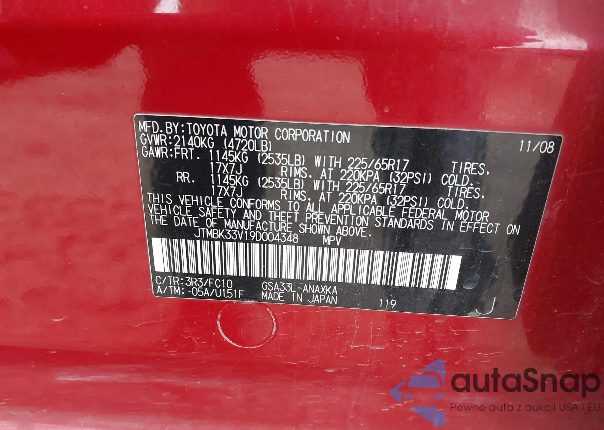LOT: 44165678 VIN: JTMBK33V19D004348