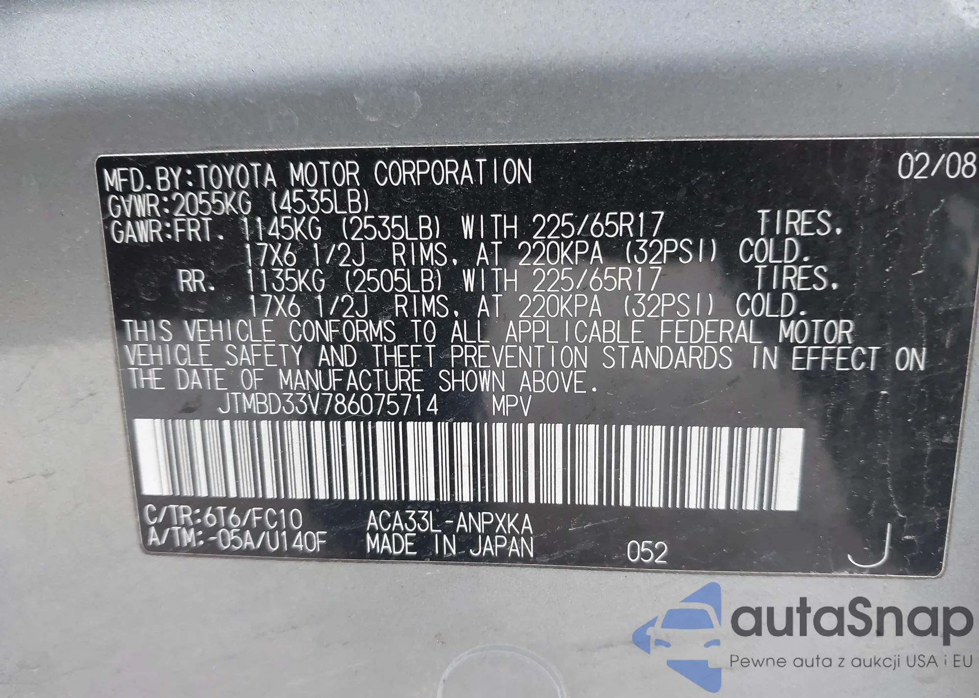LOT: 44290672 VIN: JTMBD33V786075714