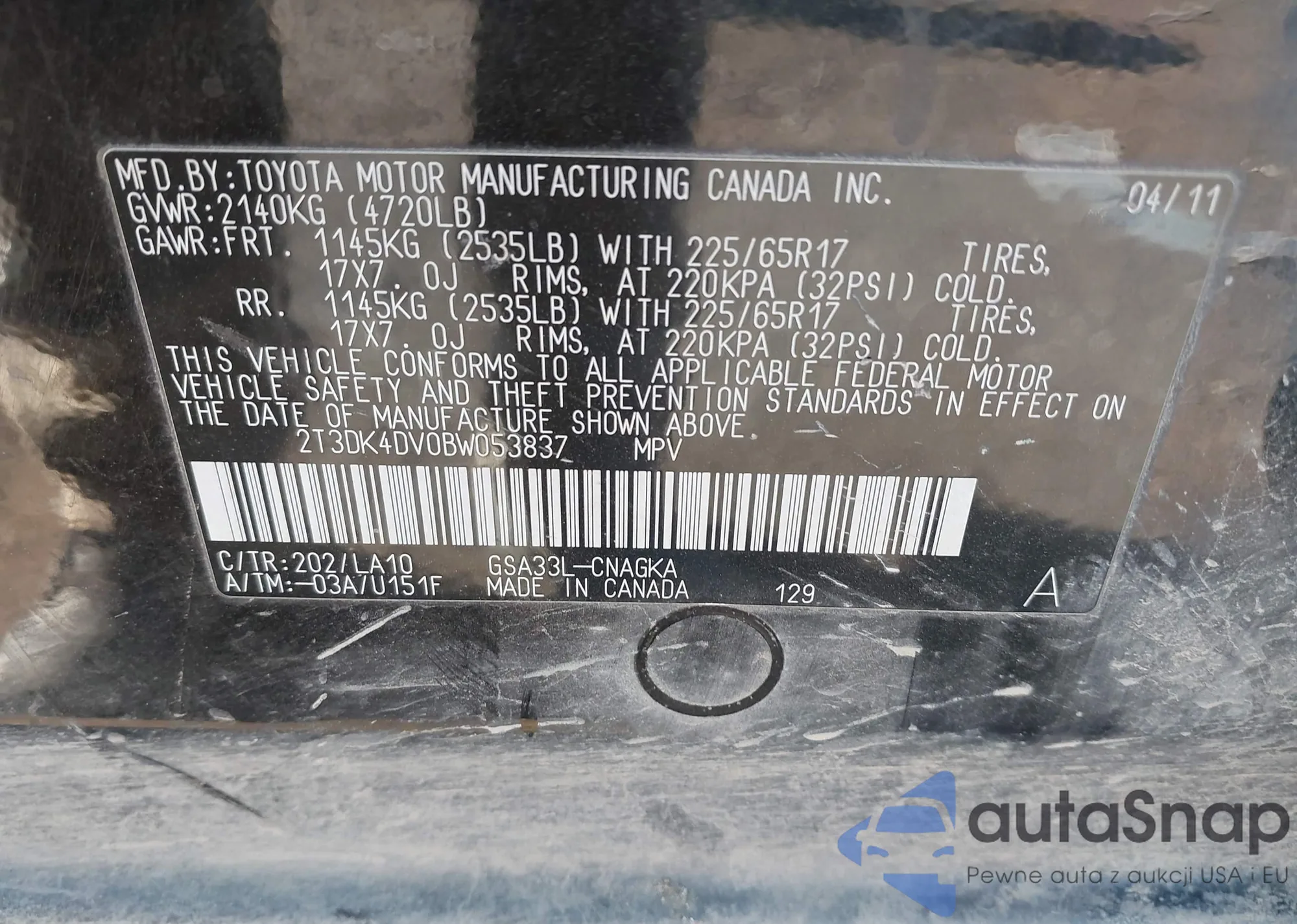 LOT: 44340160 VIN: 2T3DK4DV0BW053837