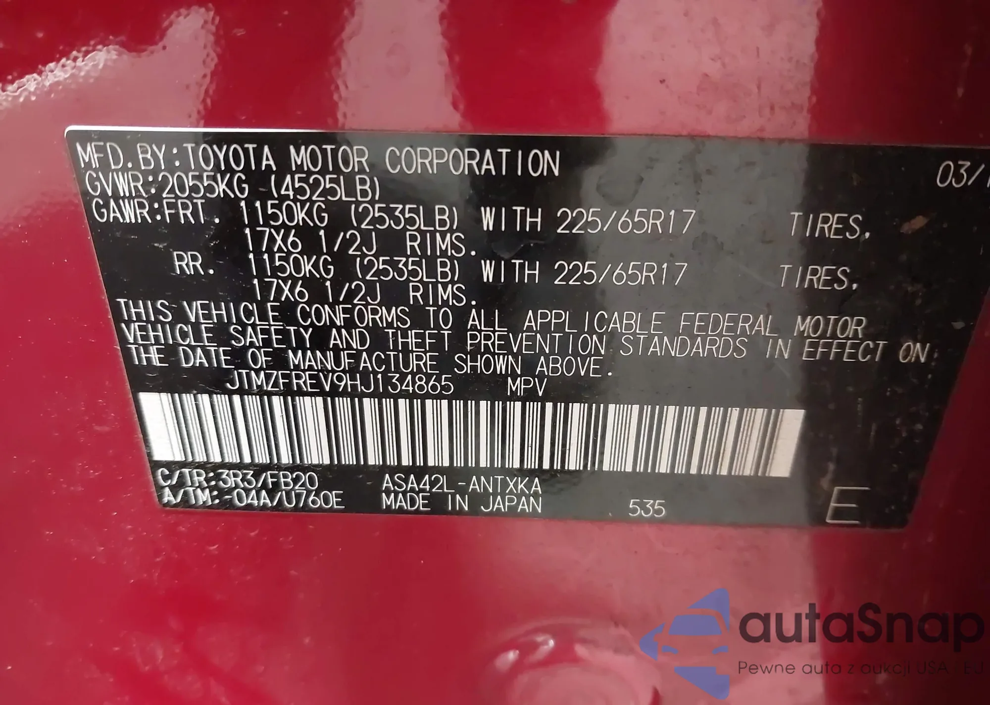 LOT: 44182293 VIN: JTMZFREV9HJ134865