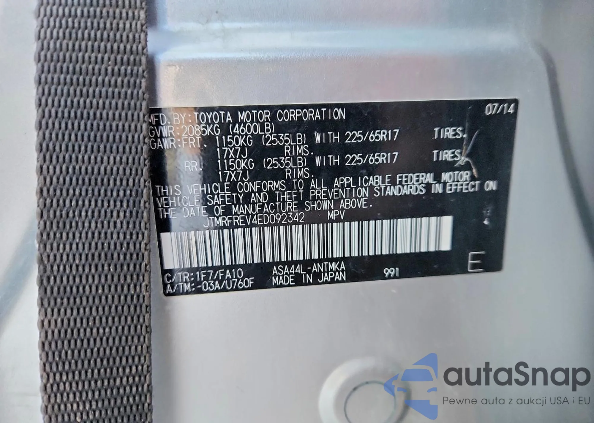 LOT: 75423905 VIN: JTMRFREV4ED092342