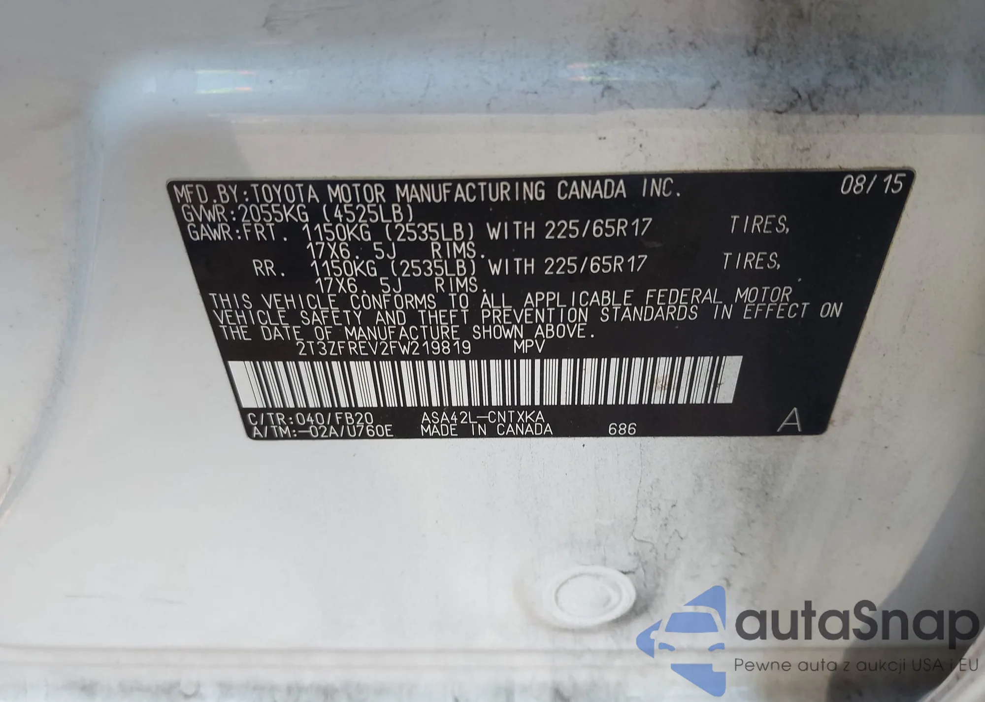 • VIN 2T3ZFREV2FW219819