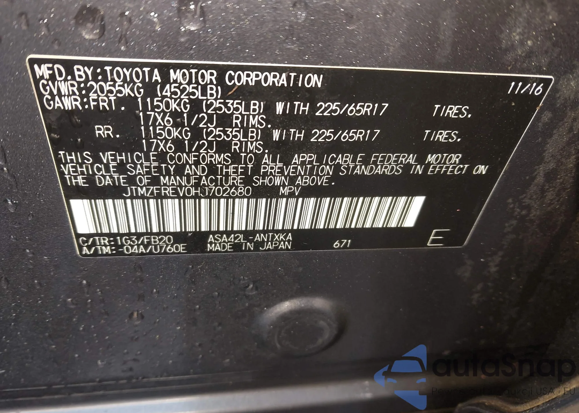 • VIN JTMZFREV0HJ702680