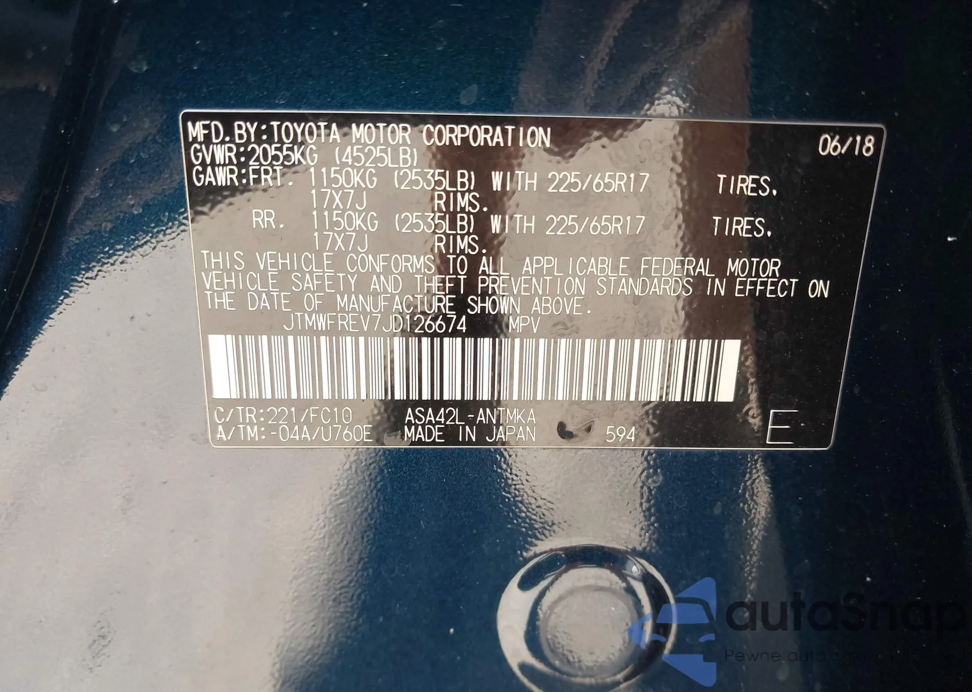 LOT: 44498505 VIN: JTMWFREV7JD126674