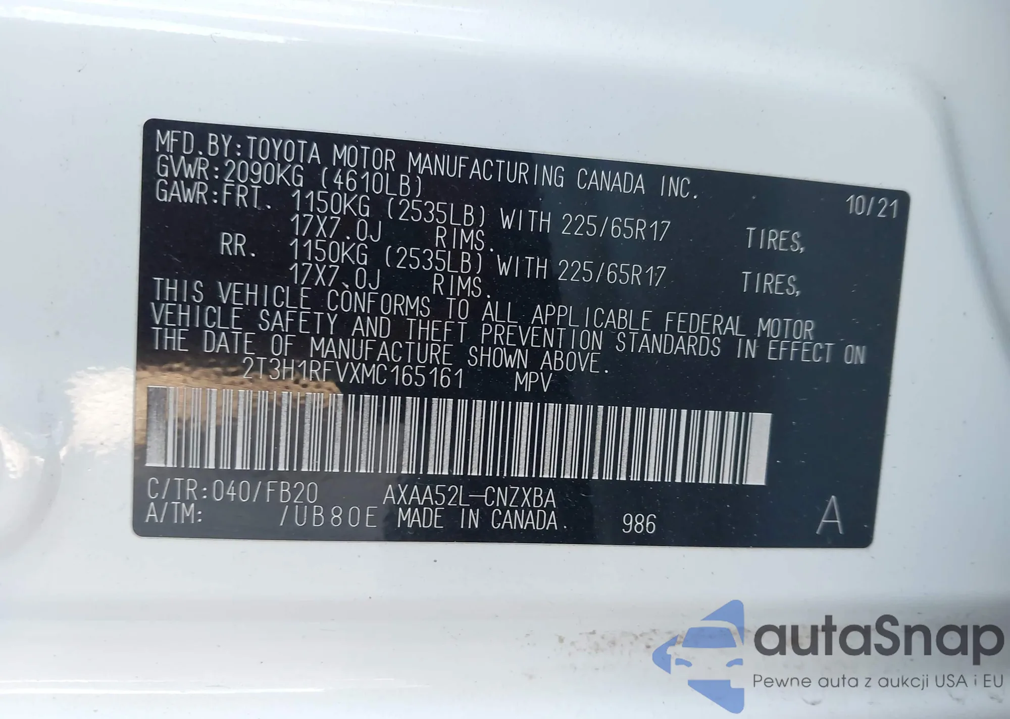 LOT: 43281409 VIN: 2T3W1RFV9MC137228