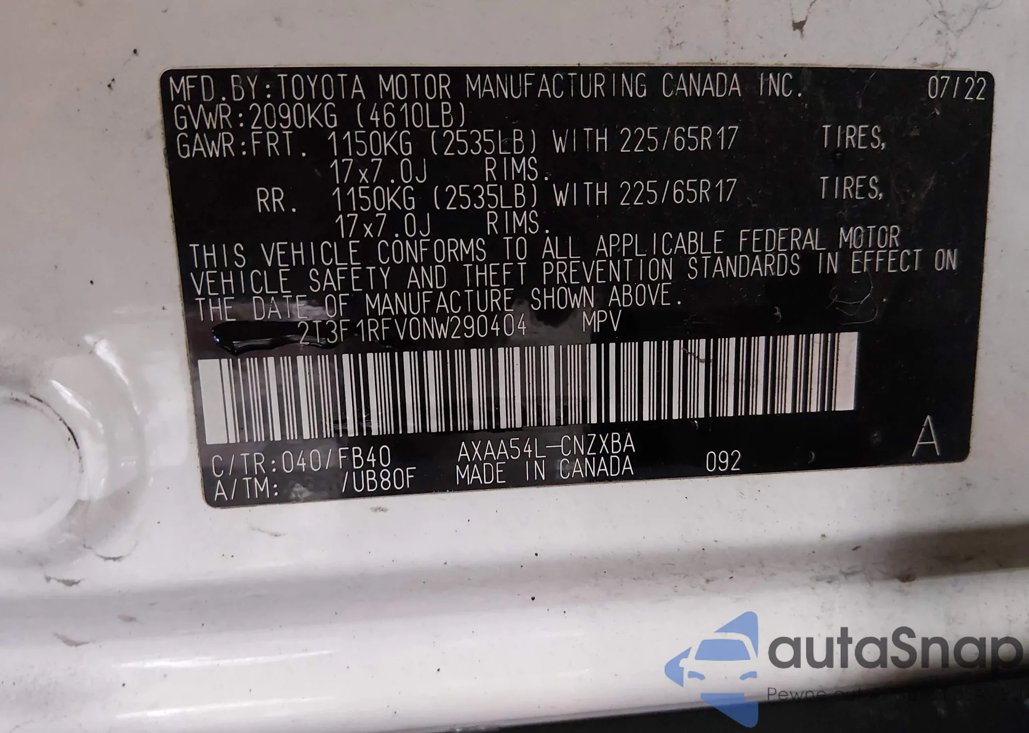 • VIN 2T3F1RFV0NW290404