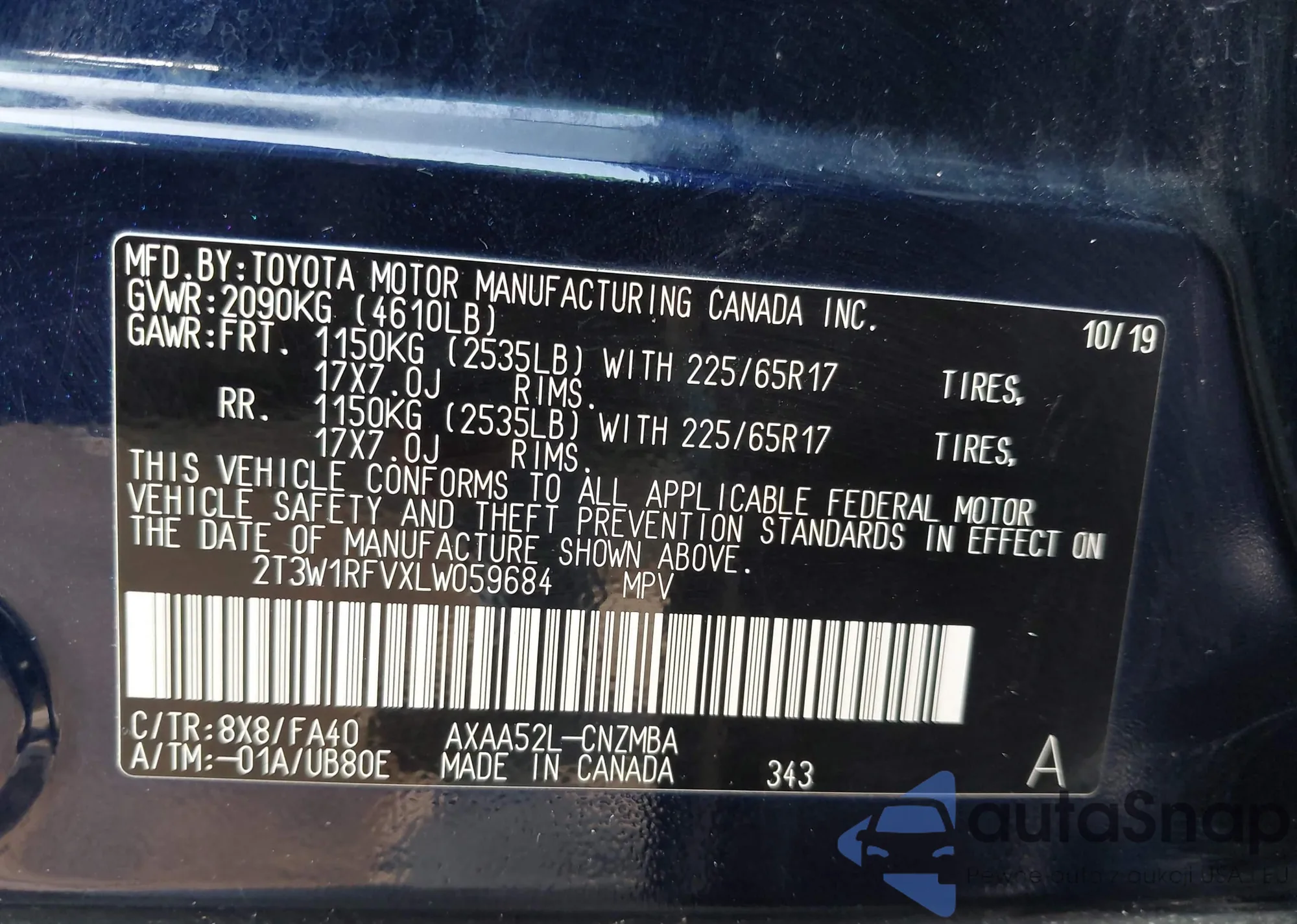 LOT: 43746202 VIN: 2T3W1RFVXLW059684