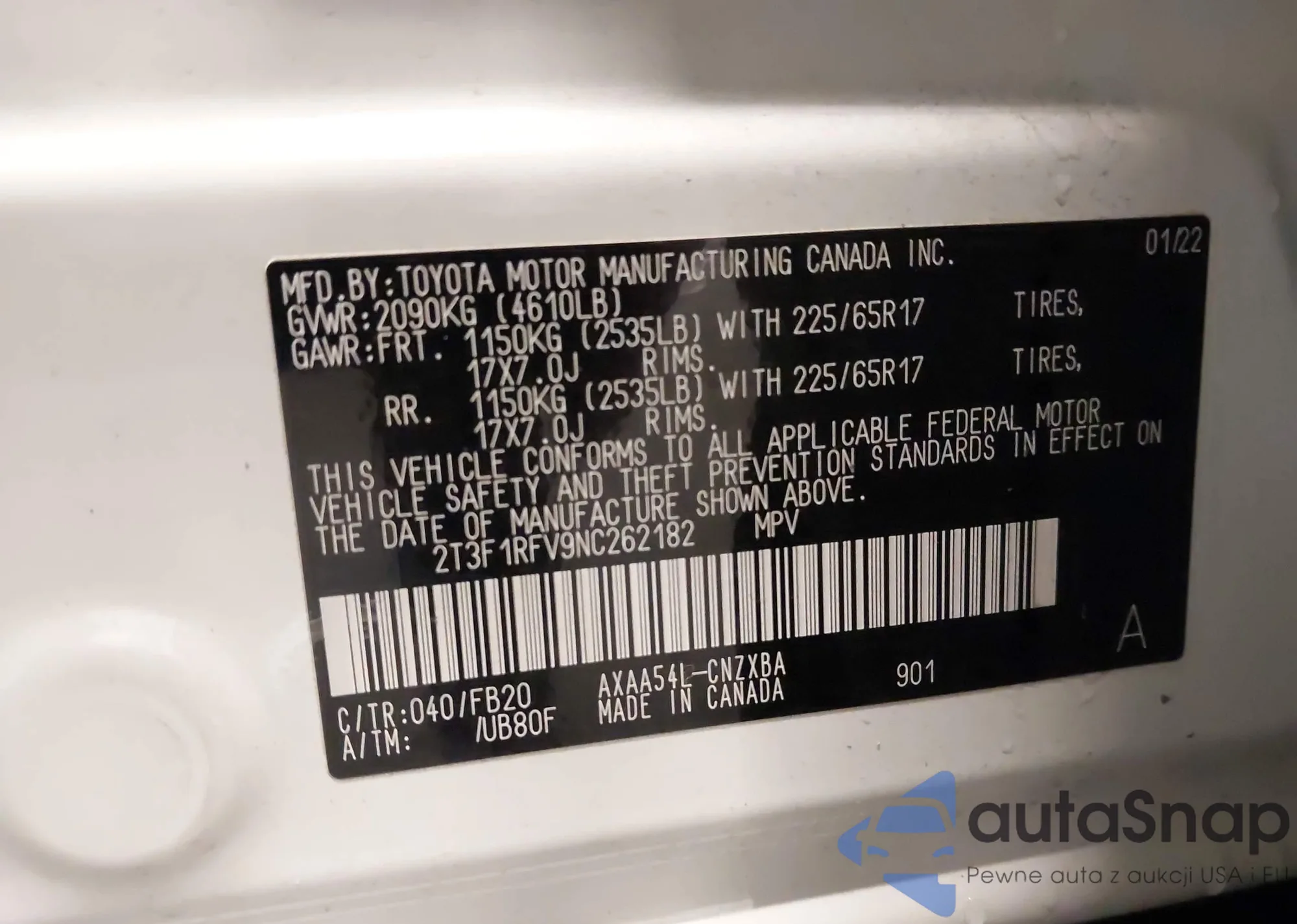 LOT: 43771563 VIN: 2T3F1RFV9NC262182
