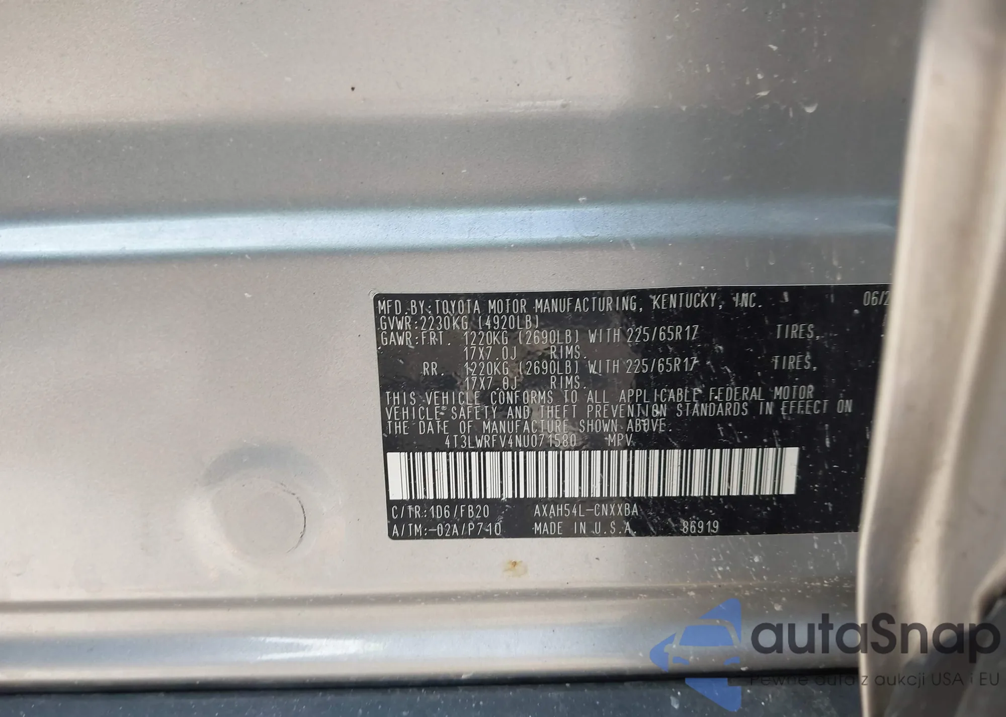 LOT: 43773193 VIN: 4T3LWRFV4NU071580