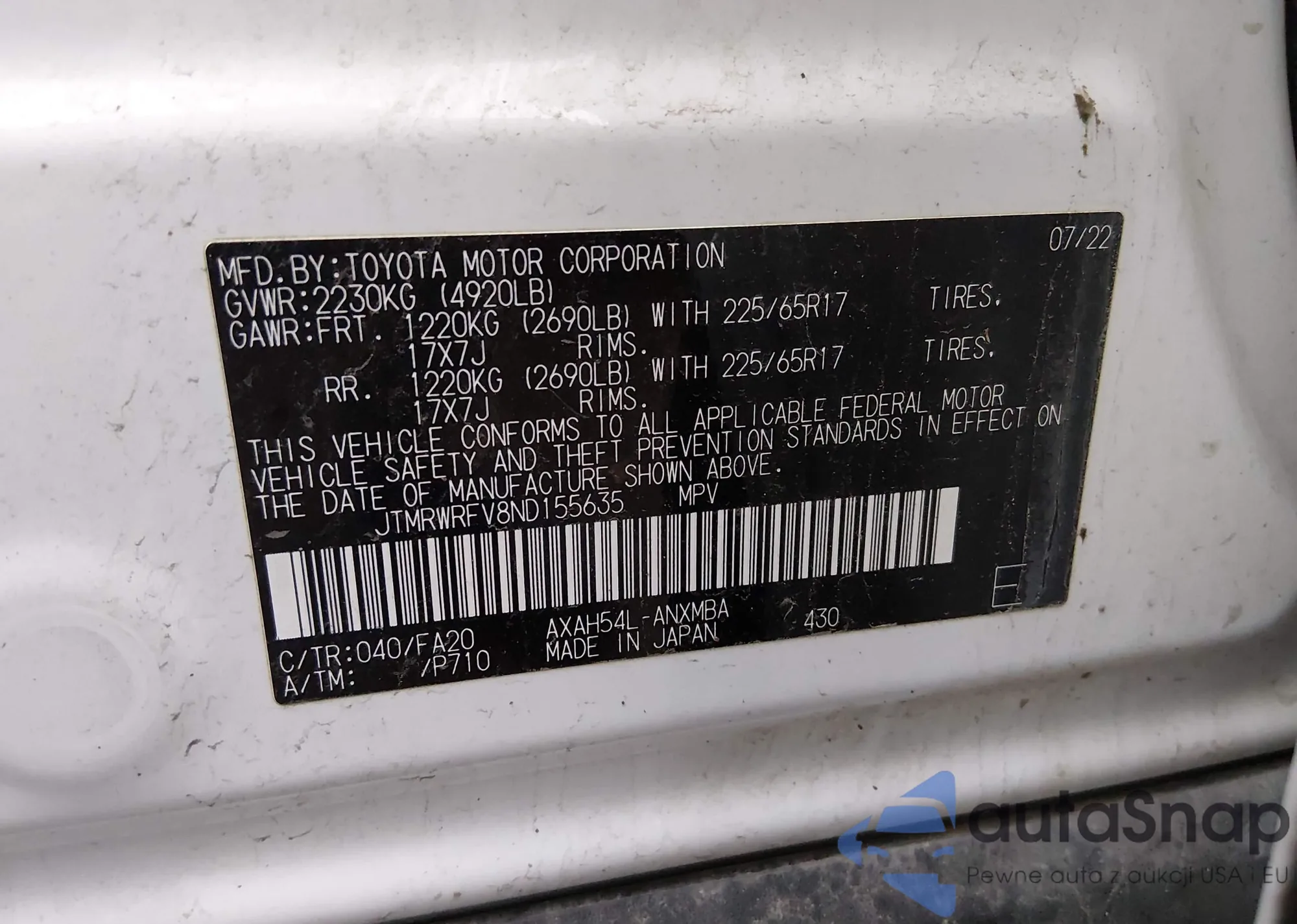 LOT: 43934432 VIN: JTMRWRFV8ND155635