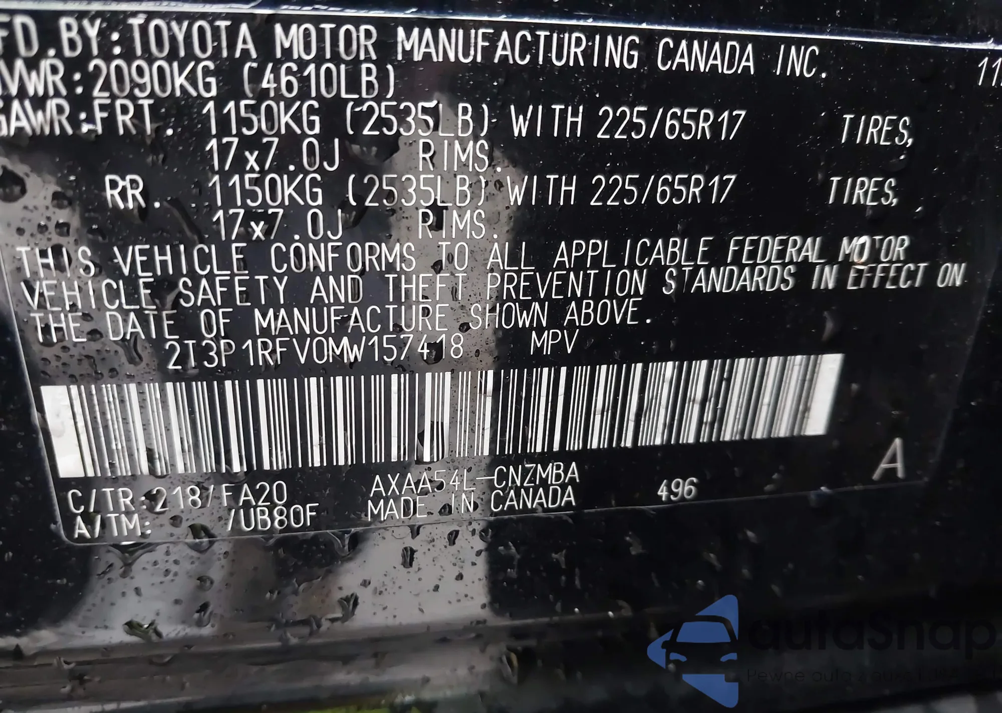 • VIN 2T3P1RFV0MW157418