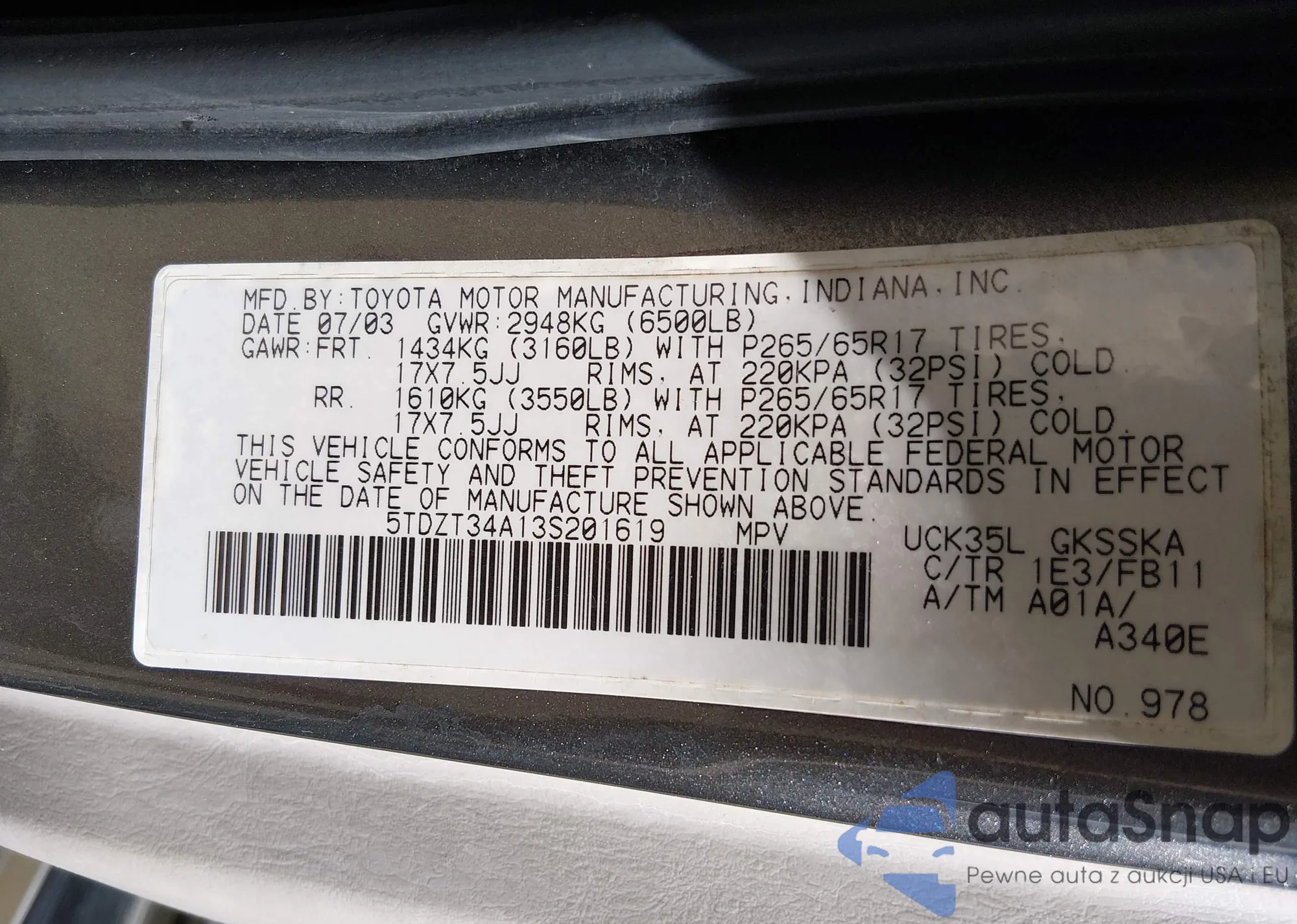 • VIN 5TDZT34A13S201619