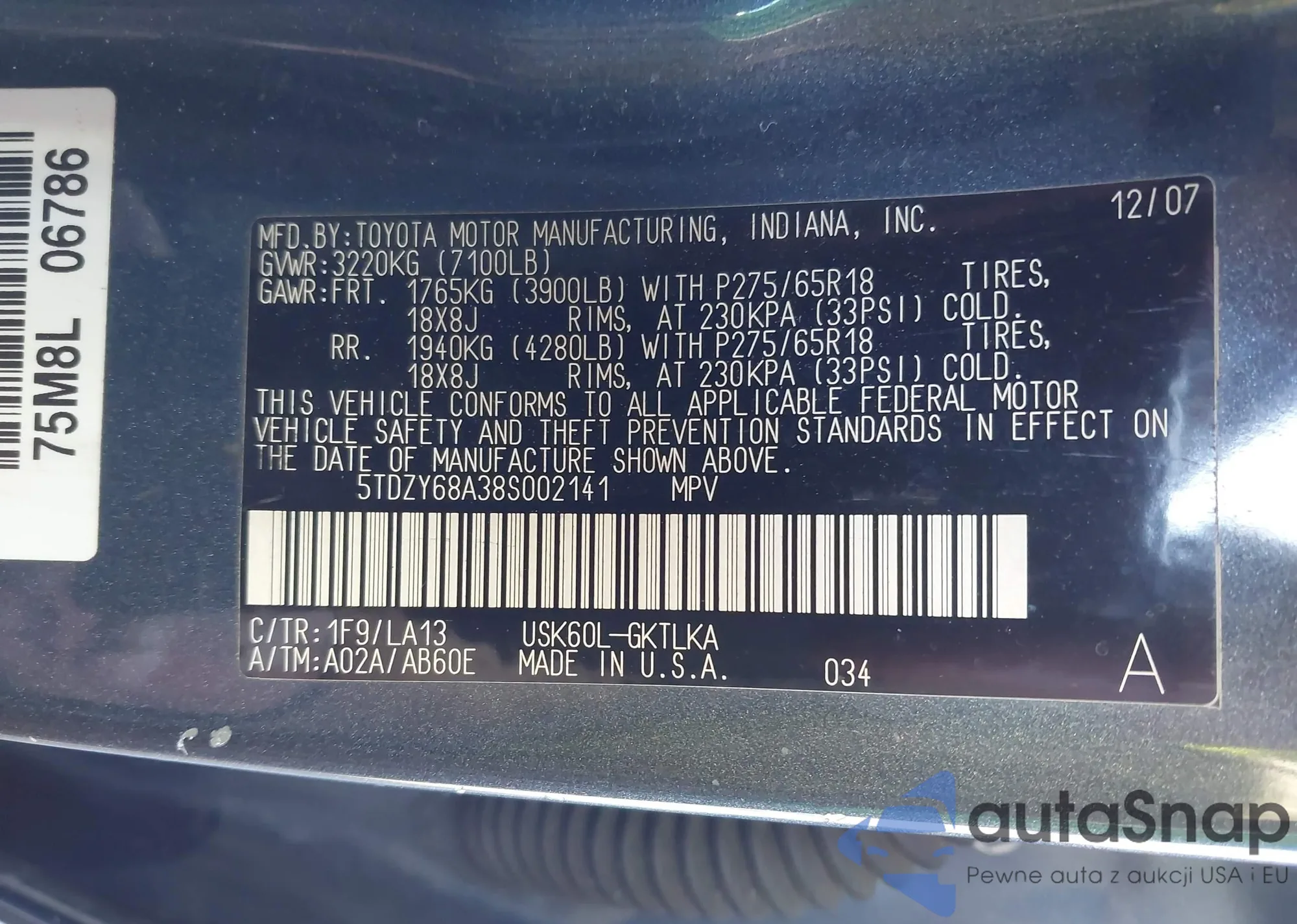 LOT: 43874334 VIN: 5TDZY68A78S003163