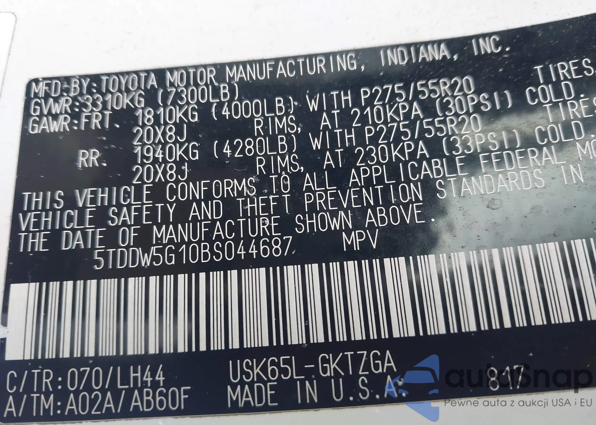 LOT: 44156731 VIN: 5TDDW5G10BS044687