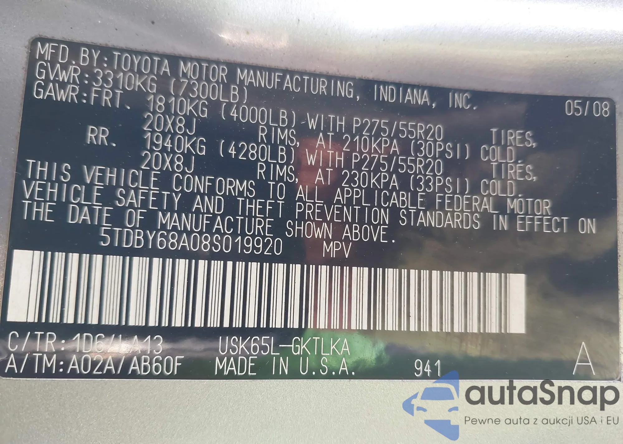 • VIN 5TDBY68A08S019920