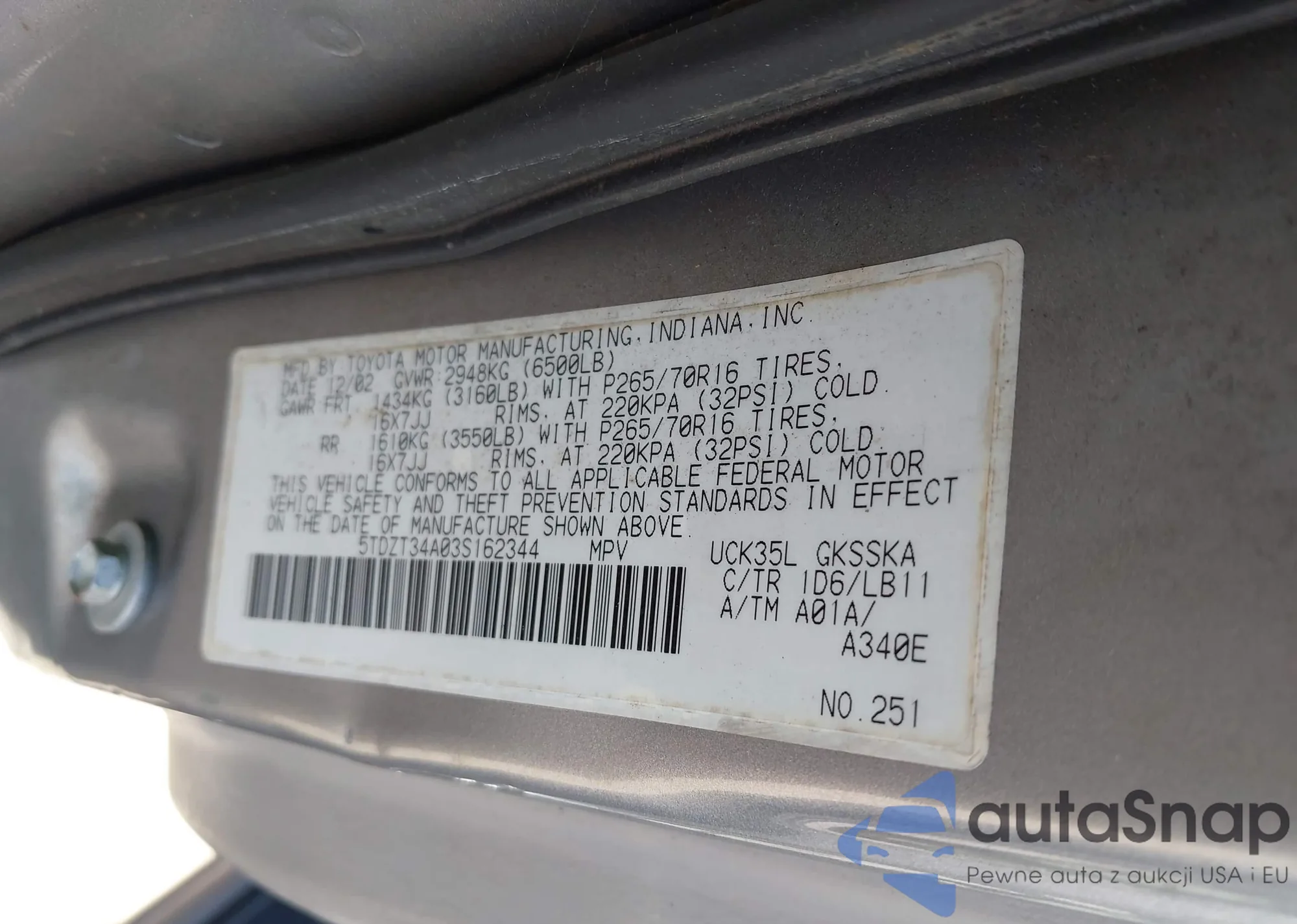 • VIN 5TDZT34A03S162344
