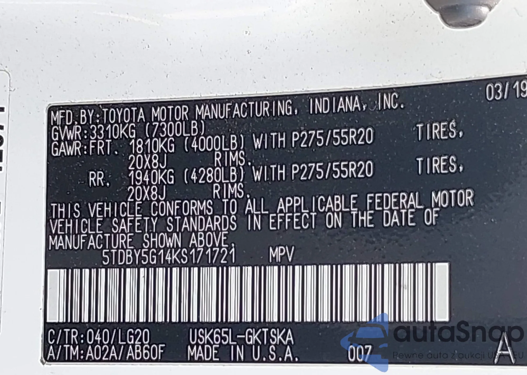 LOT: 44391901 VIN: 5TDBY5G14KS171721