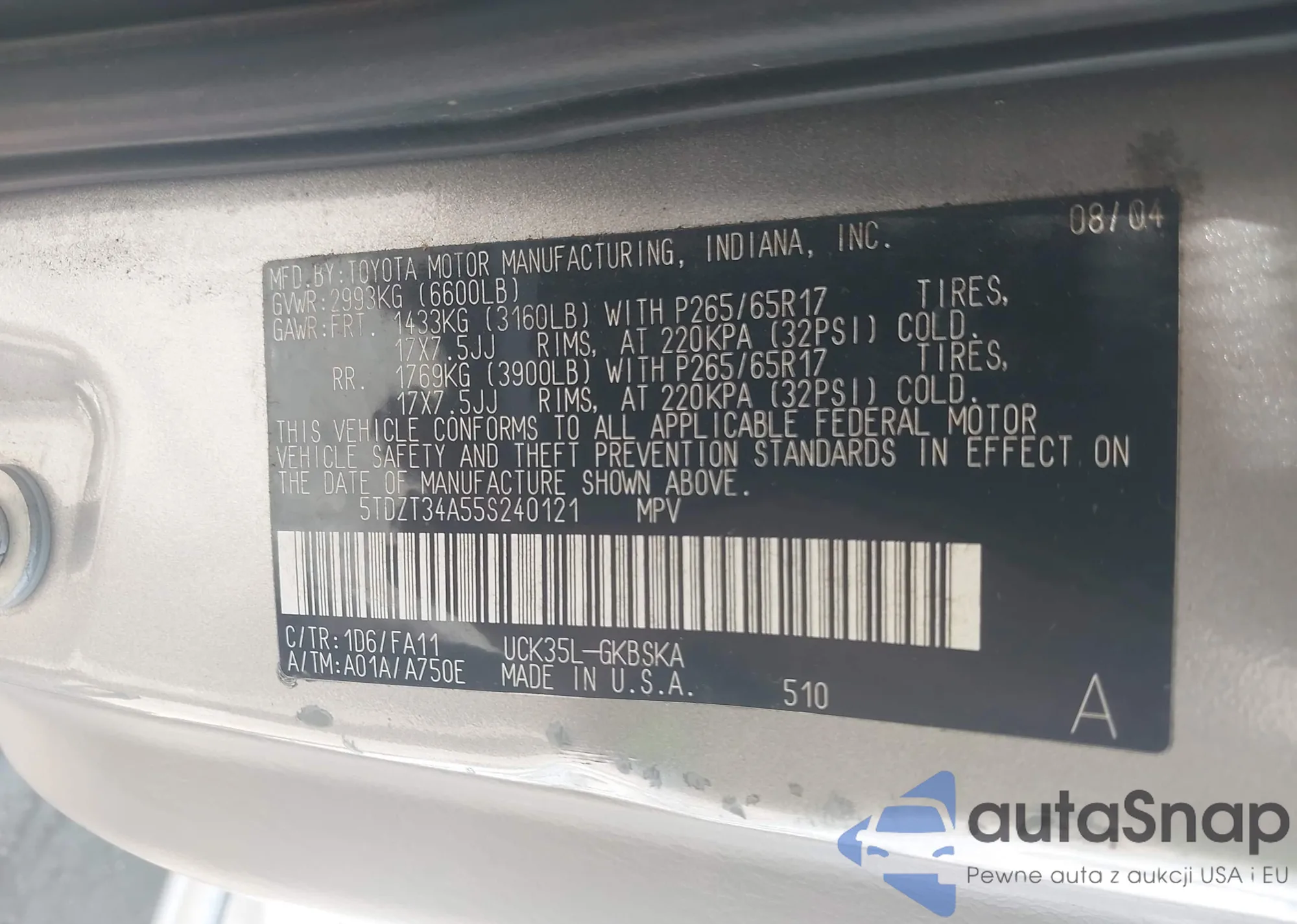 LOT: 44385210 VIN: 5TDZT34A55S240121
