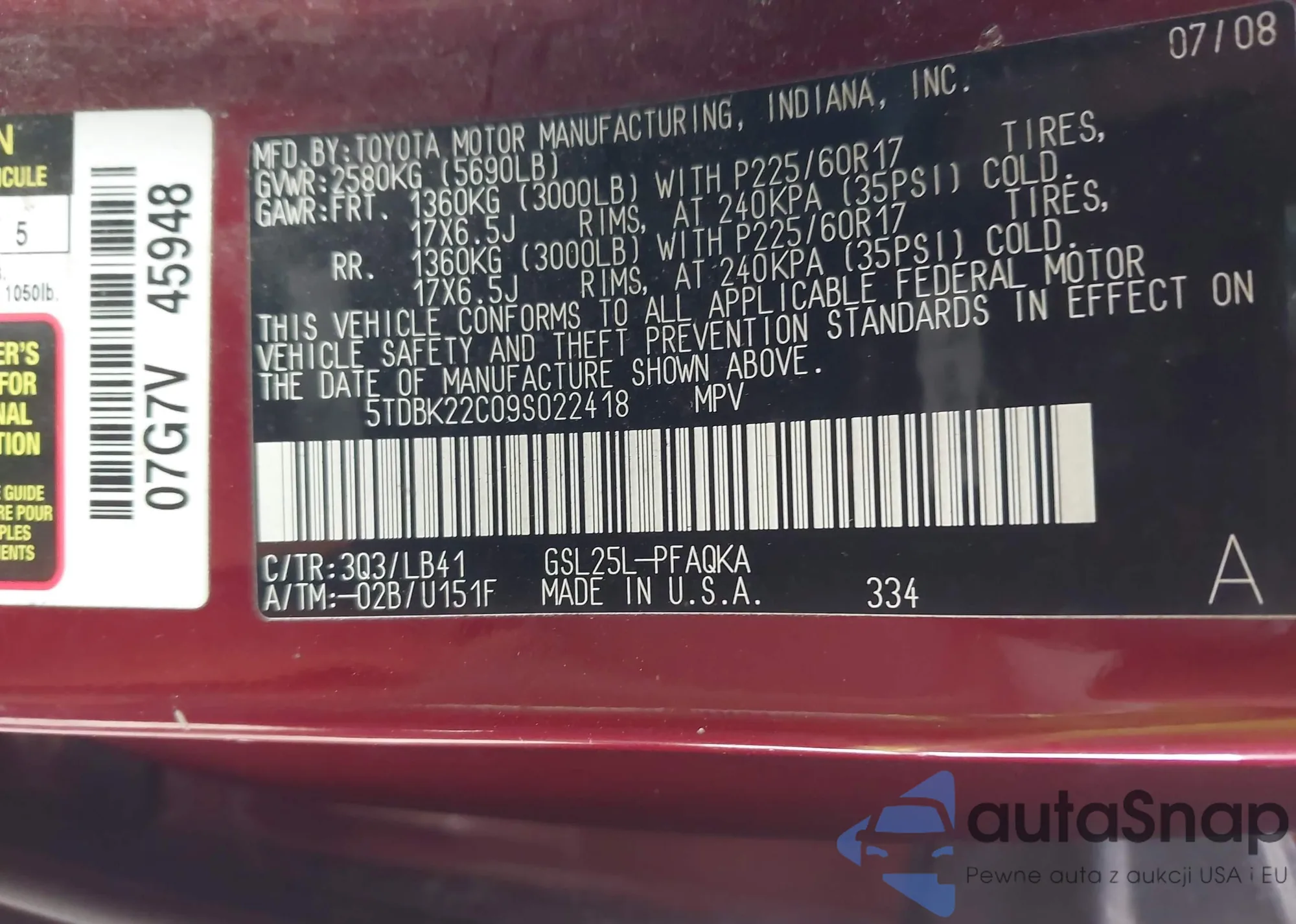 LOT: 44065249 VIN: 5TDZK22C47S096808