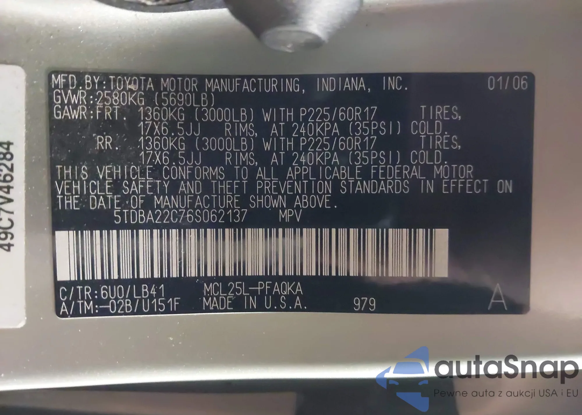 • VIN 5TDBA22C76S062137