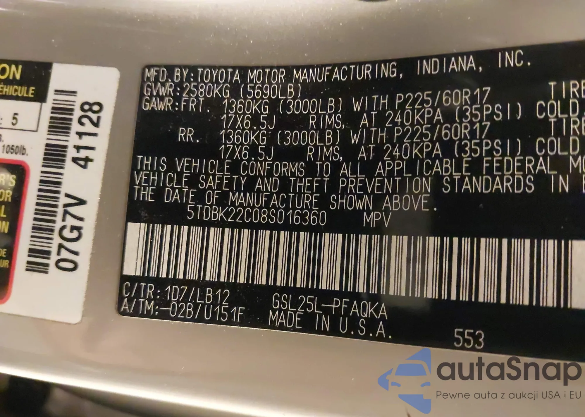 LOT: 44333699 VIN: 5TDBK22C08S016360