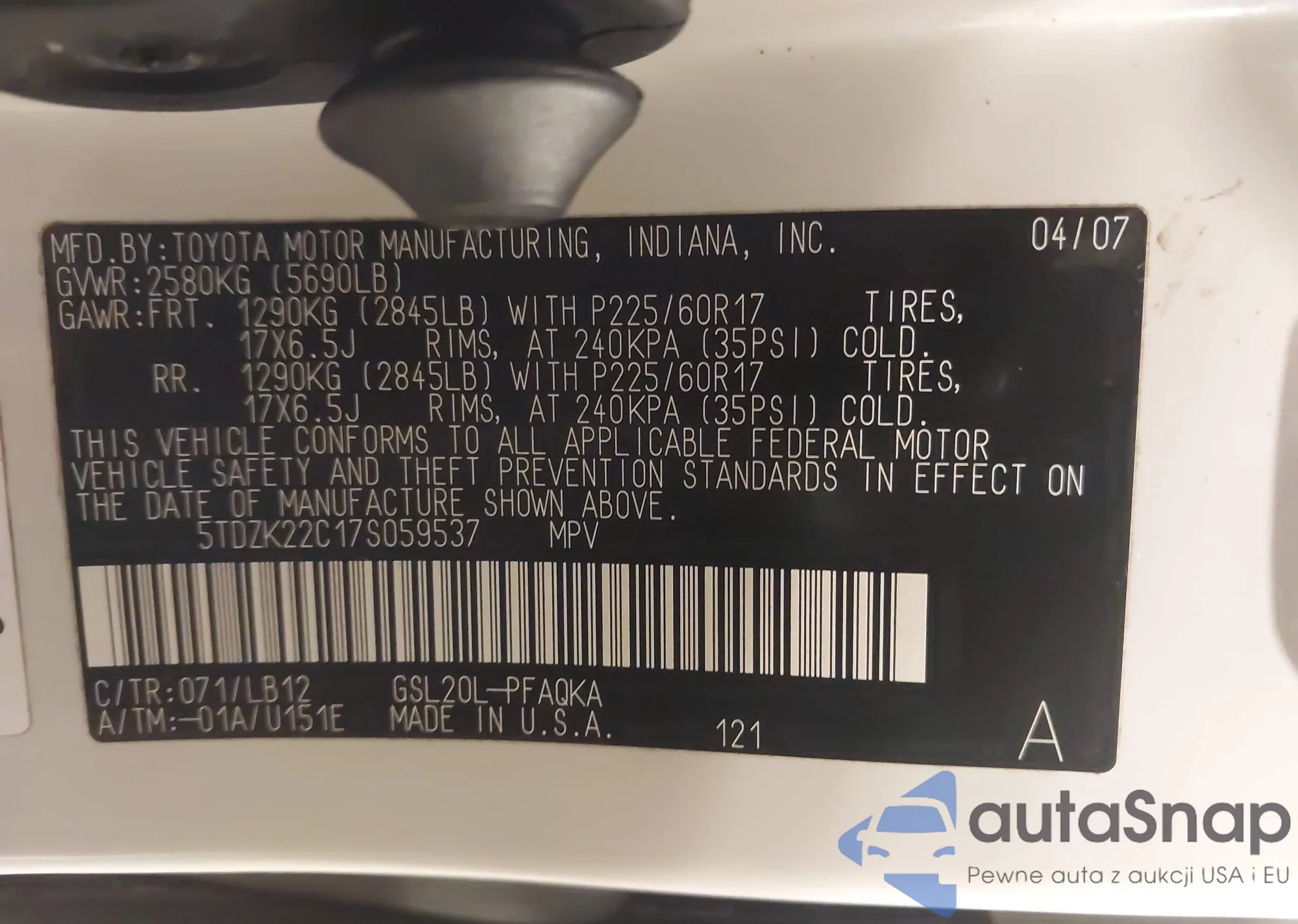 LOT: 43852204 VIN: 5TDZK22C17S059537