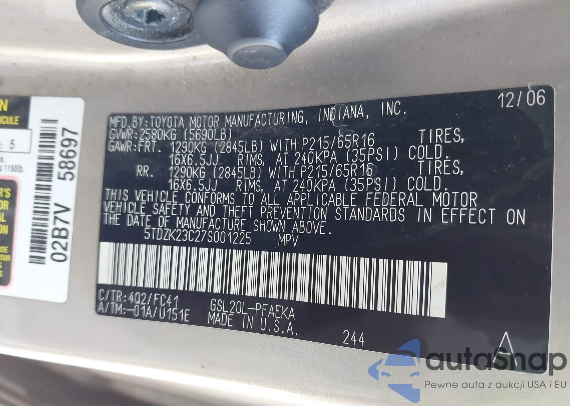 LOT: 44699289 VIN: 5TDZK23C27S001225